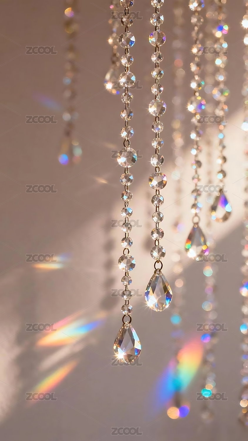 水晶吊灯,彩色棱镜,光芒四射,室内装饰,灯光效果,奢华氛围,透明晶体,金色支架,柔和光线,家居设计