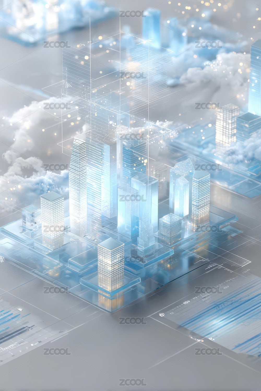 3d商务科技风云层中城市建筑插画