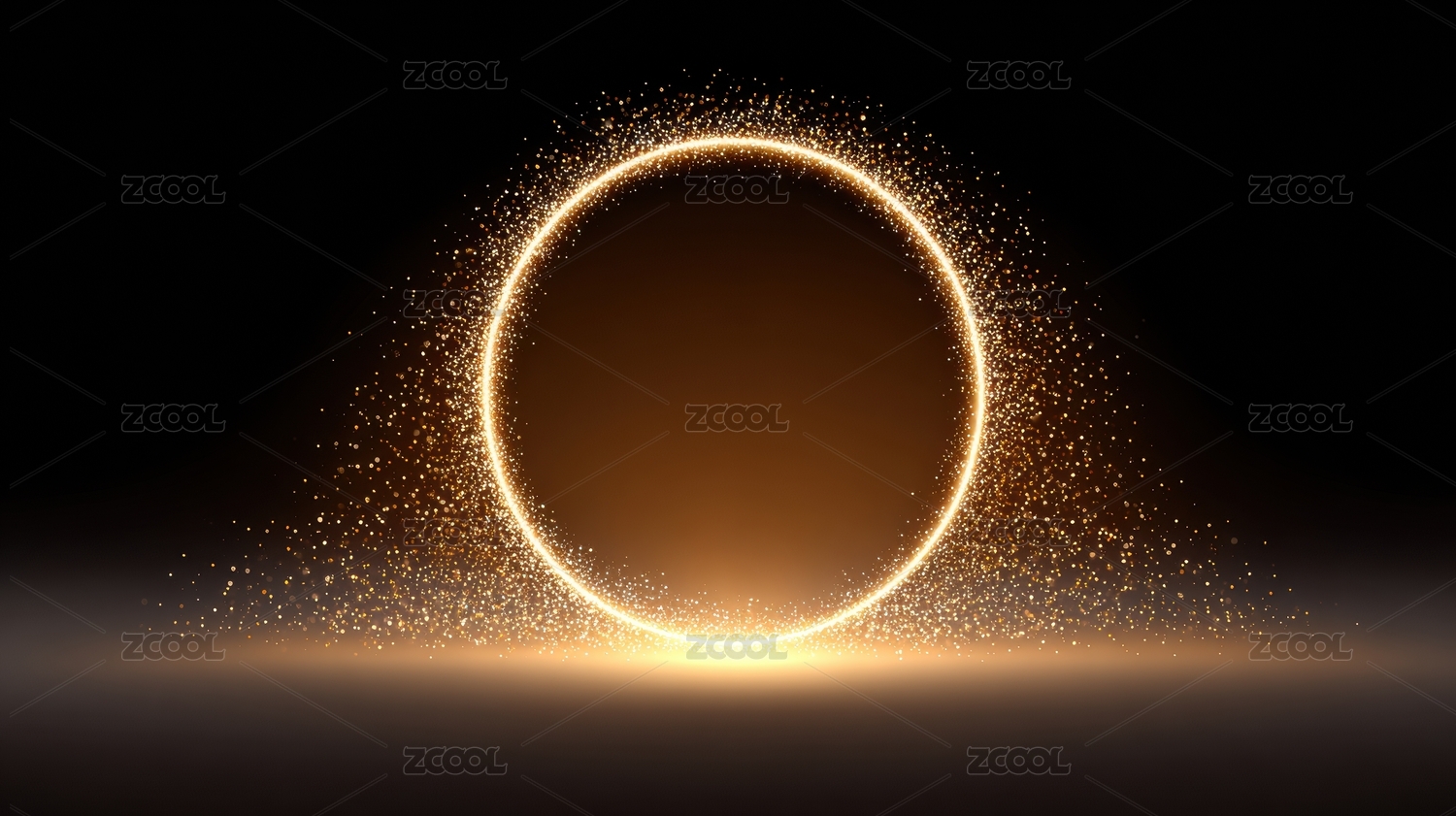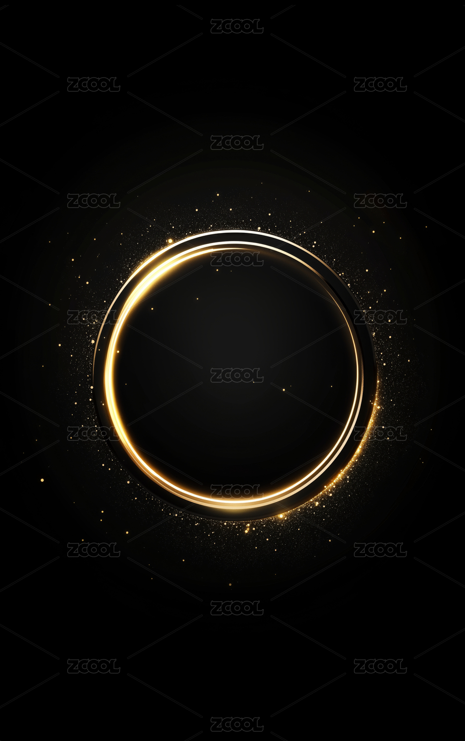 黑色背景上闪耀的金色圆环与闪亮光芒