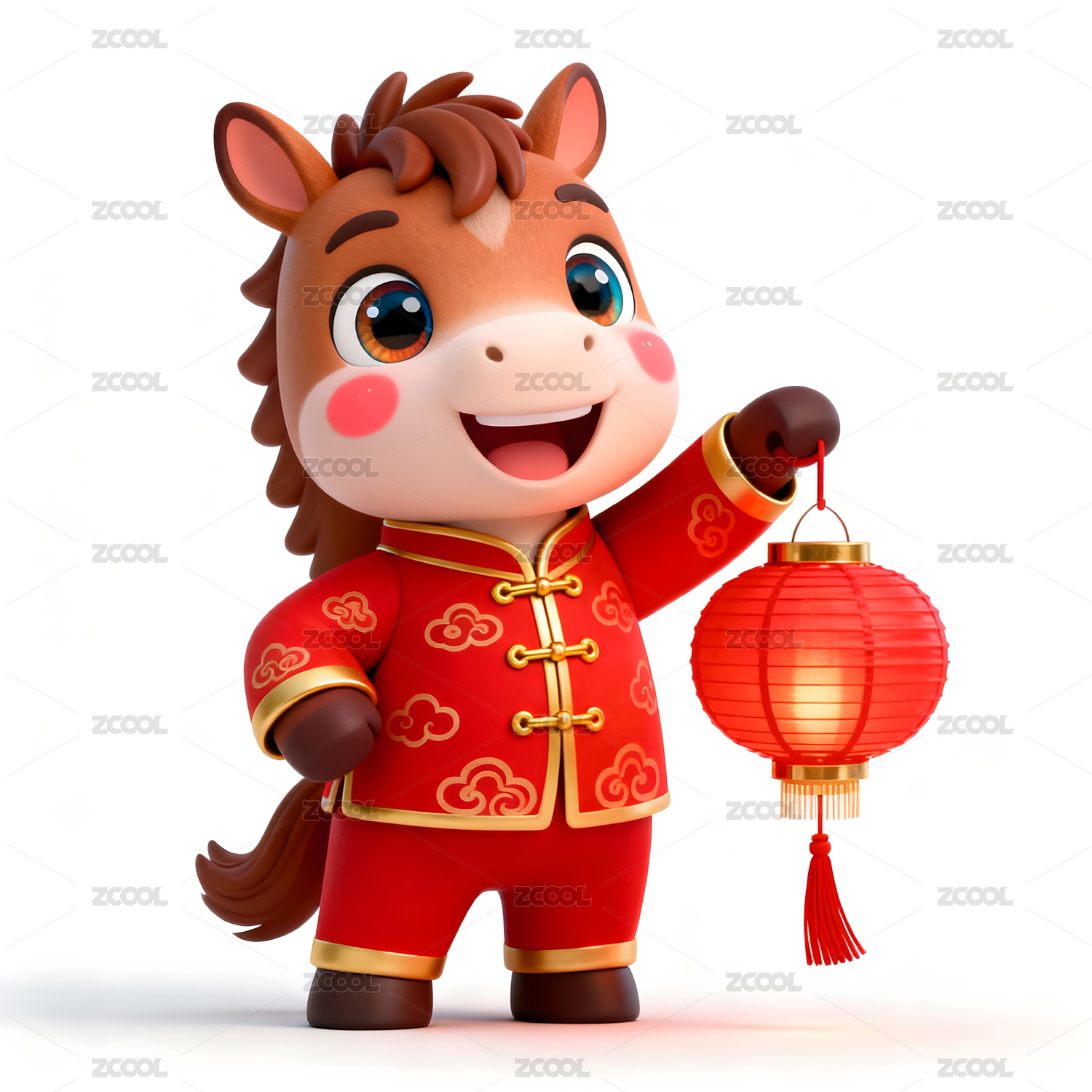3D卡通吉祥物马IP手持福袋贺岁插画图