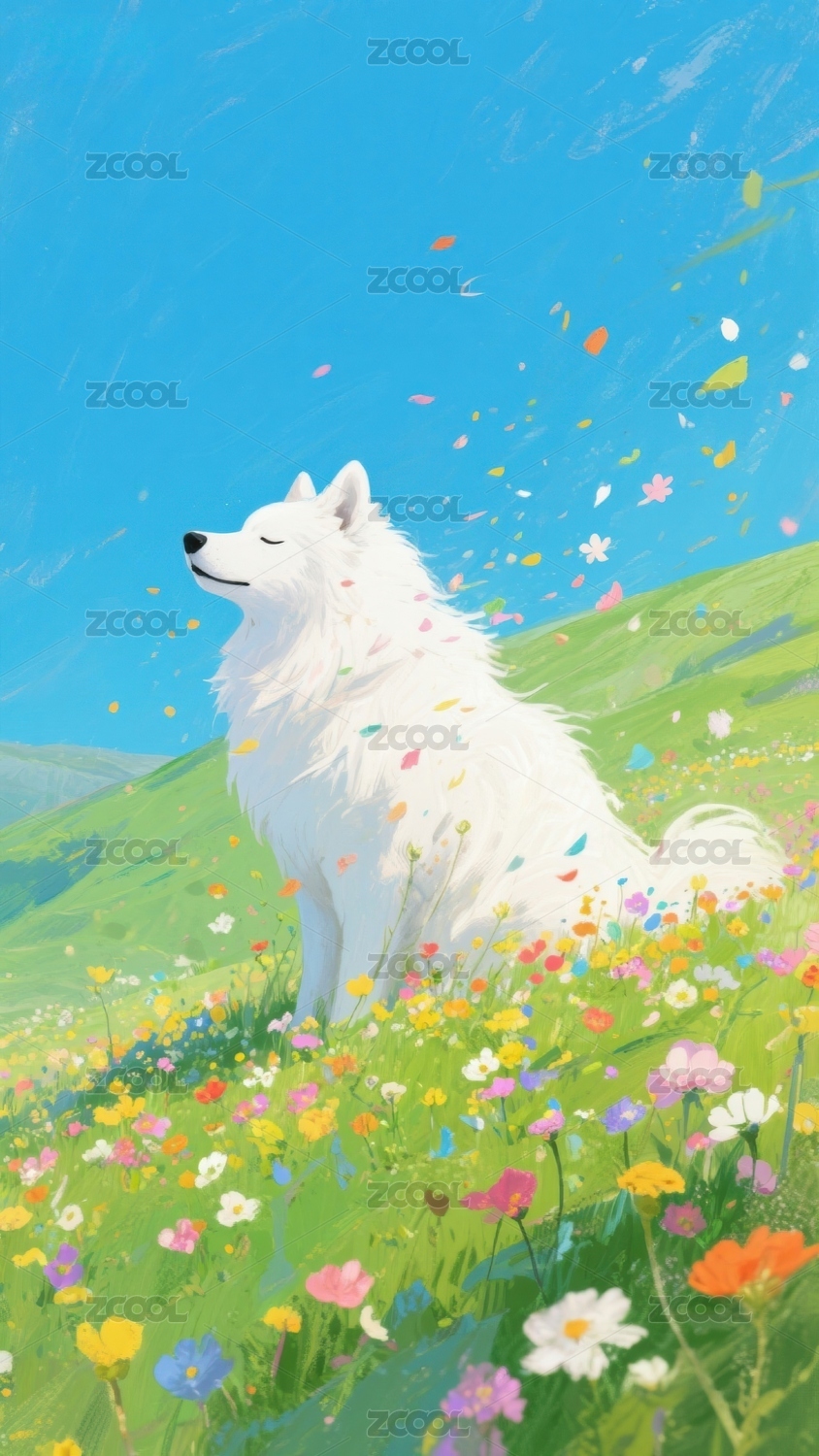 画面,自然,天空,动物,花朵,白狗,草地,奔跑,白云,绿草