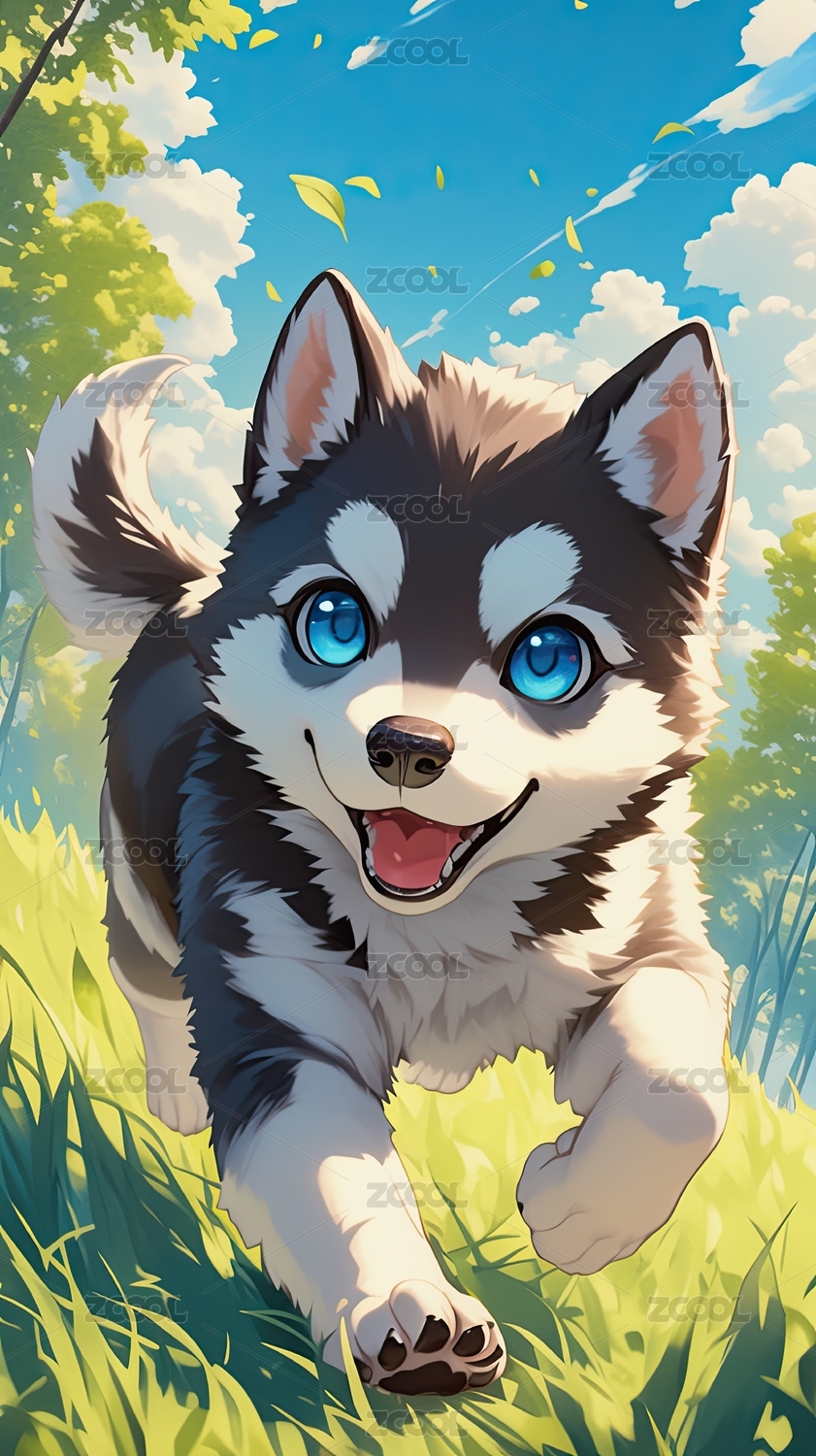 卡通风格的哈士奇在阳光下奔跑