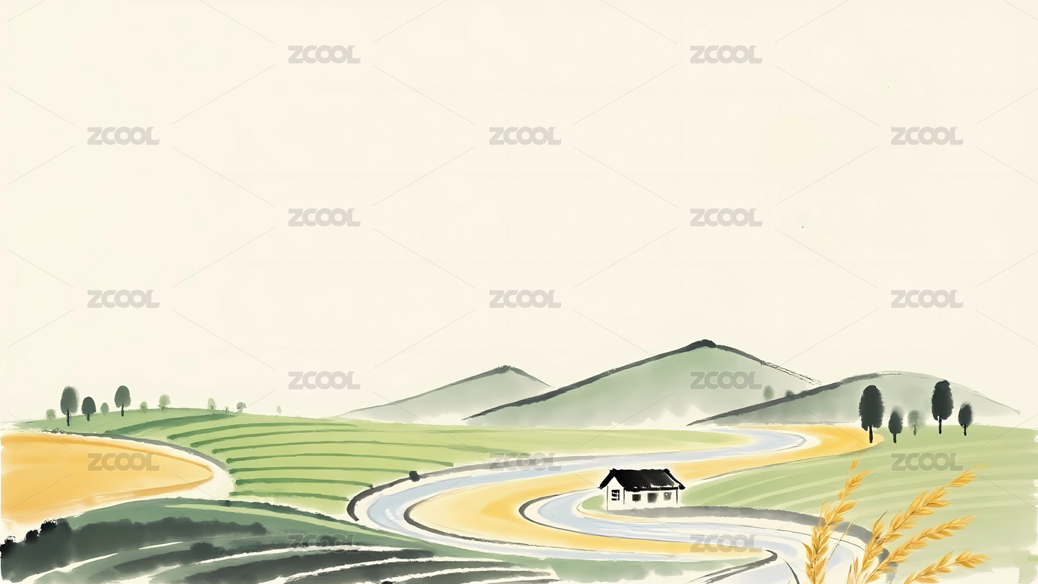 田园,山水,房屋,树木,小路,麦田,水墨画,中国风,墨色,黄色