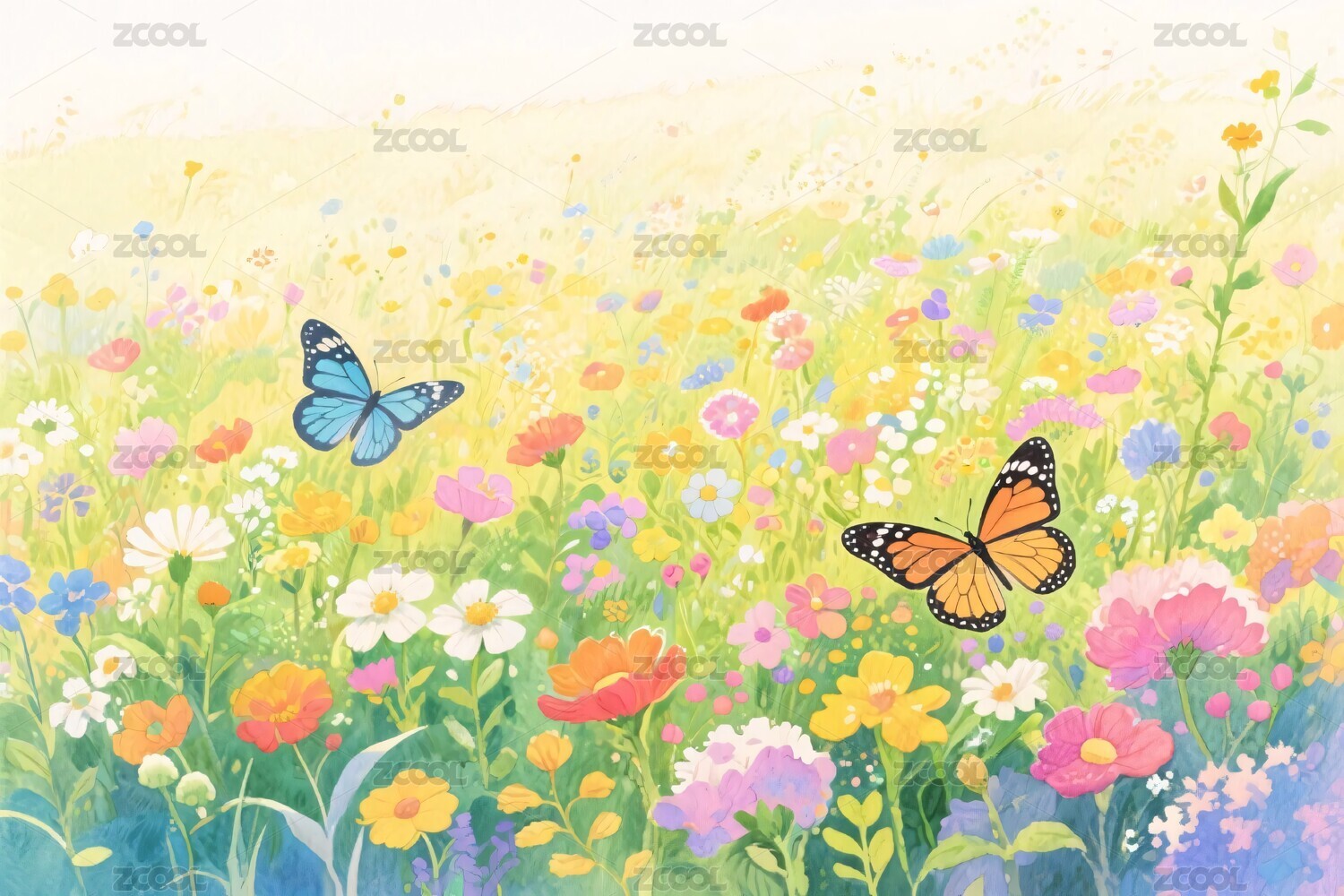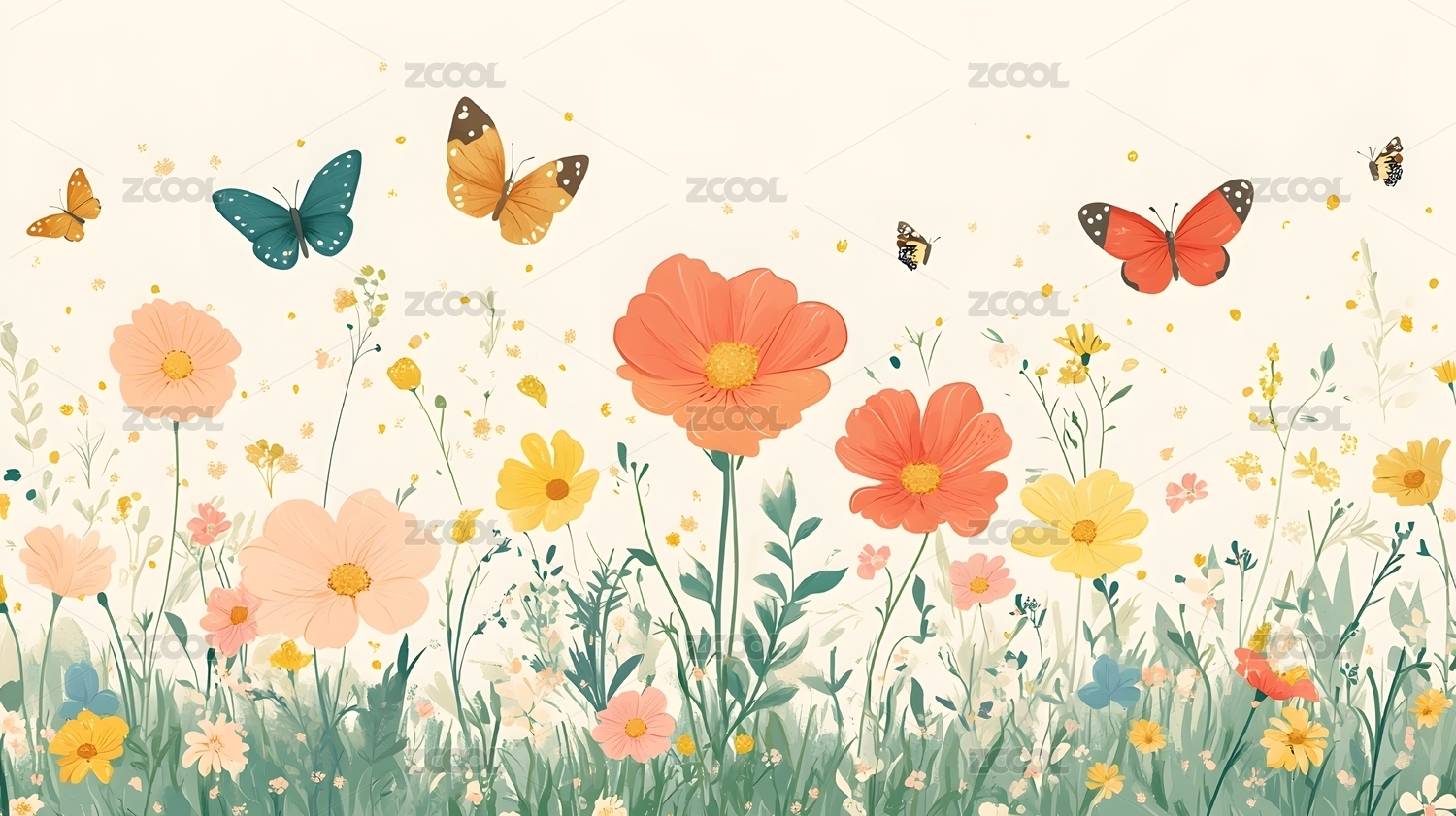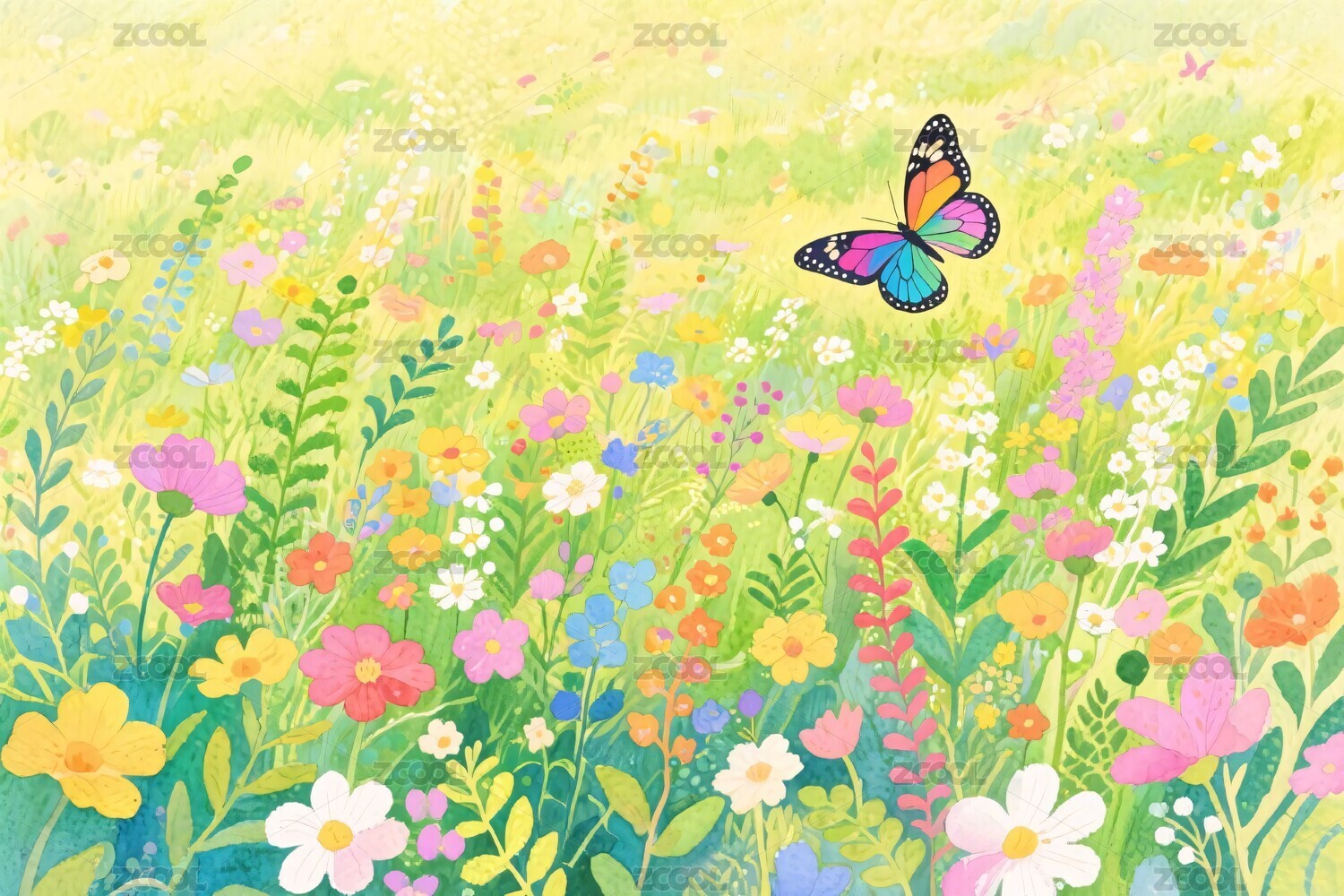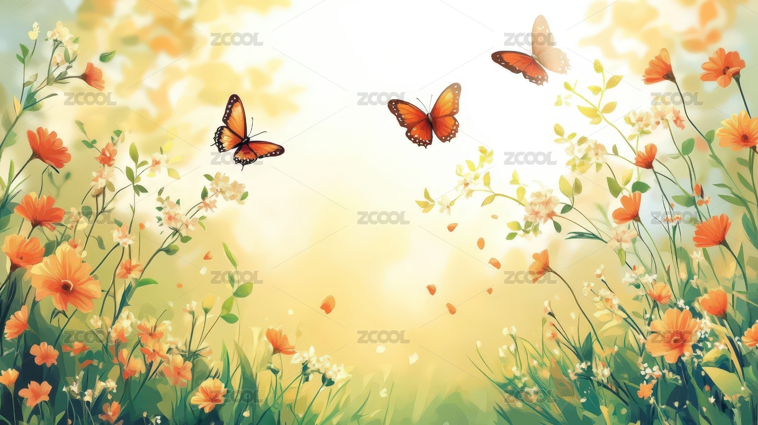 蝴蝶,花朵,花丛,绿色背景,清新,自然,唯美,插画,春天,浪漫