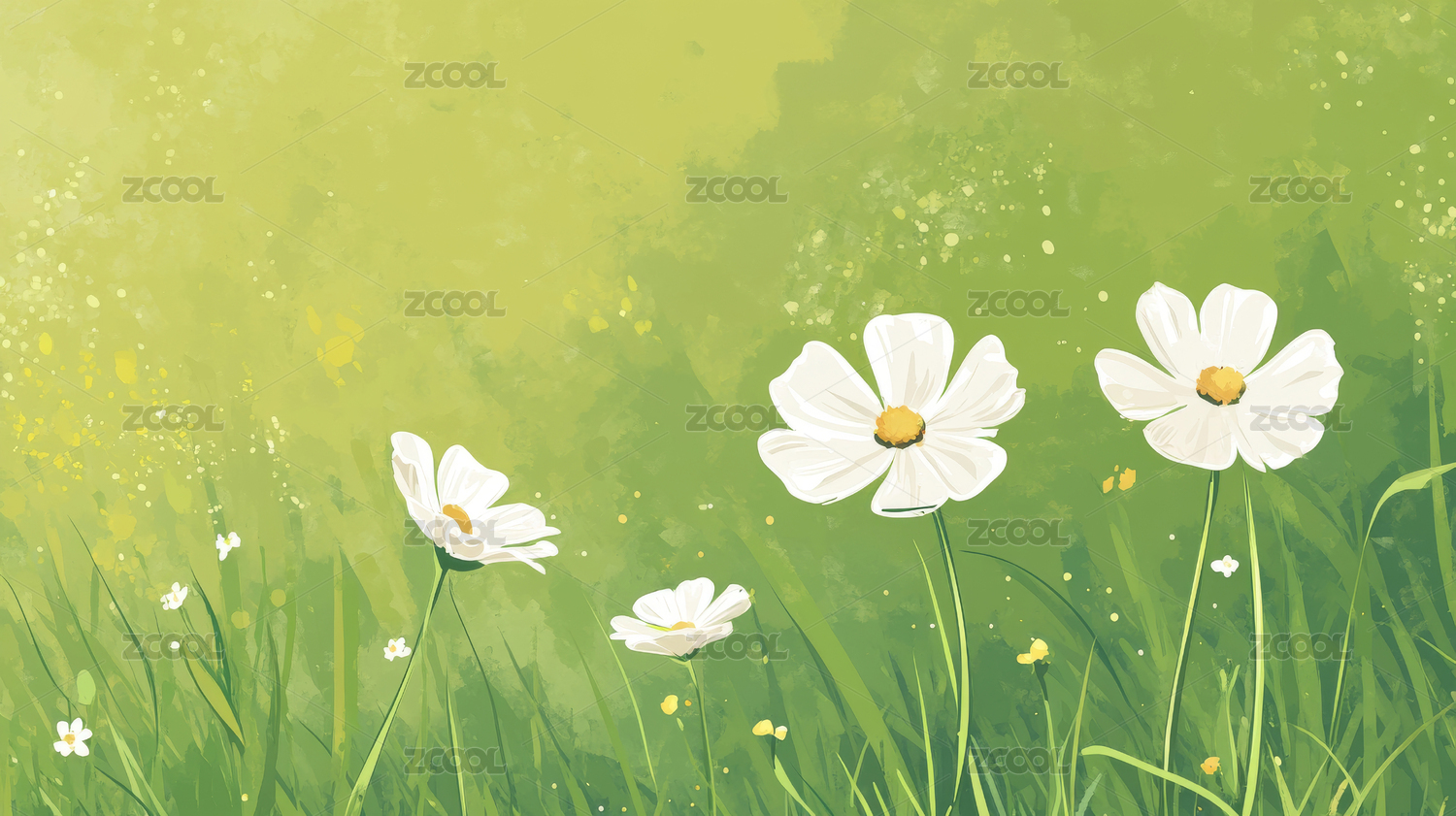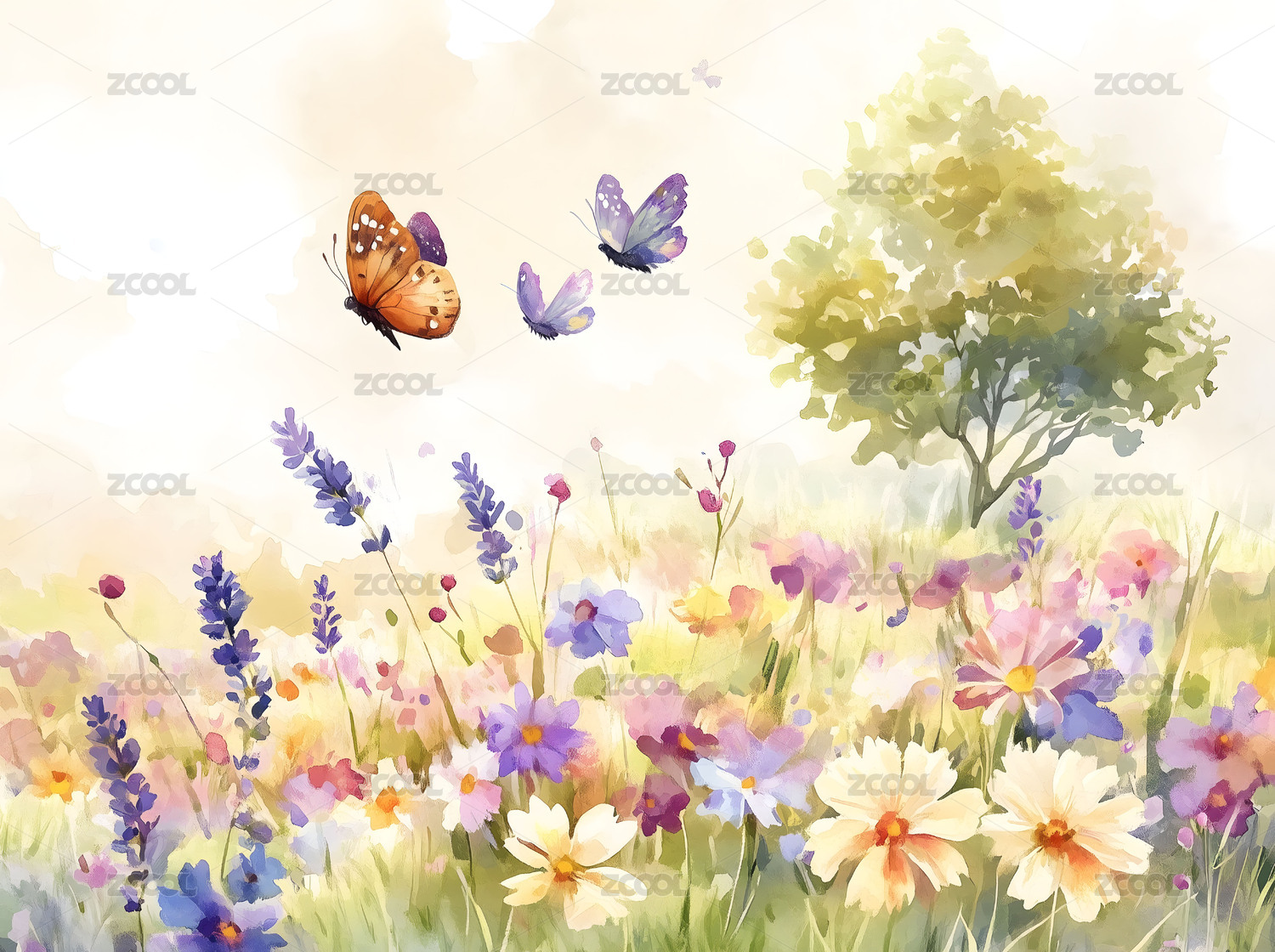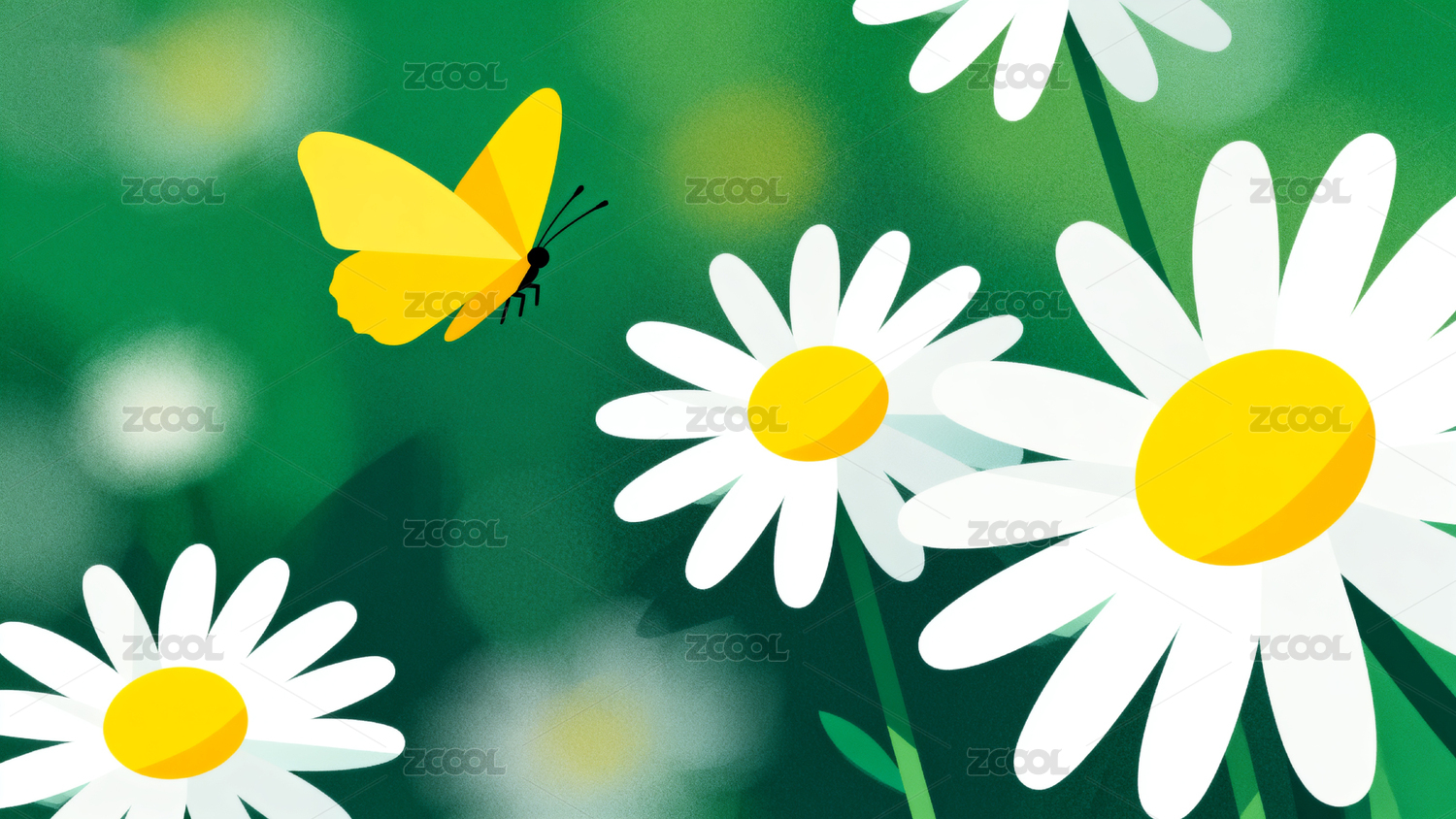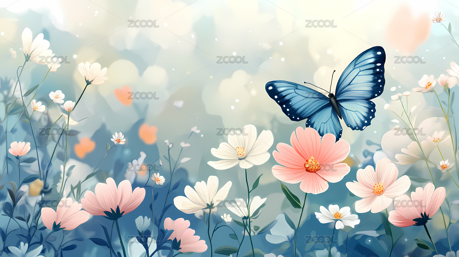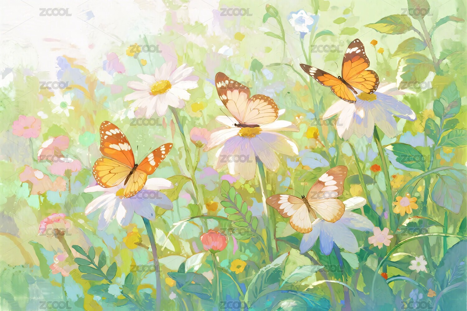 蝴蝶,花朵,花丛,绿色背景,清新,自然,唯美,插画,春天,浪漫