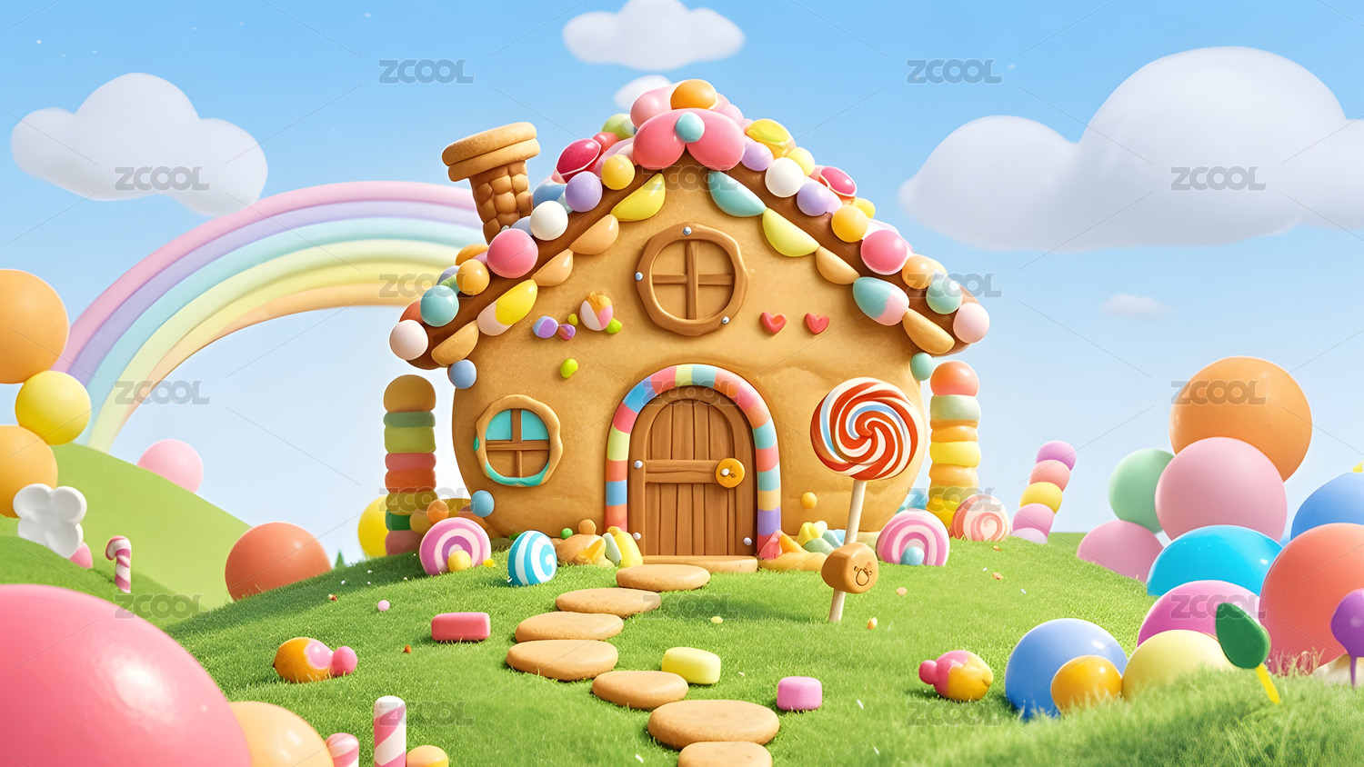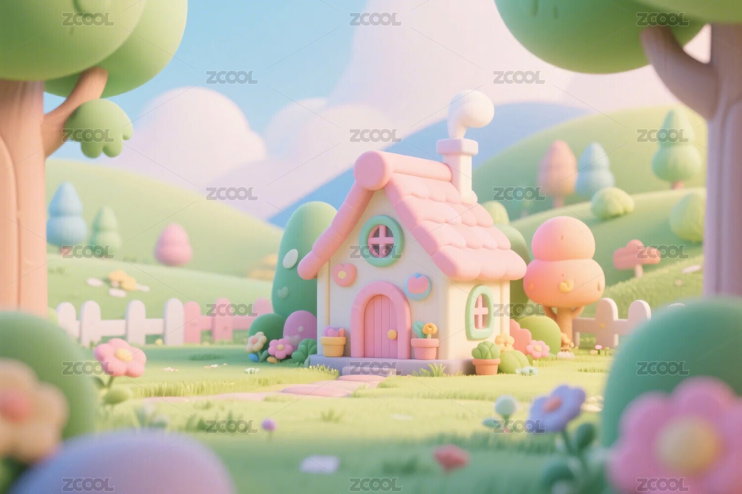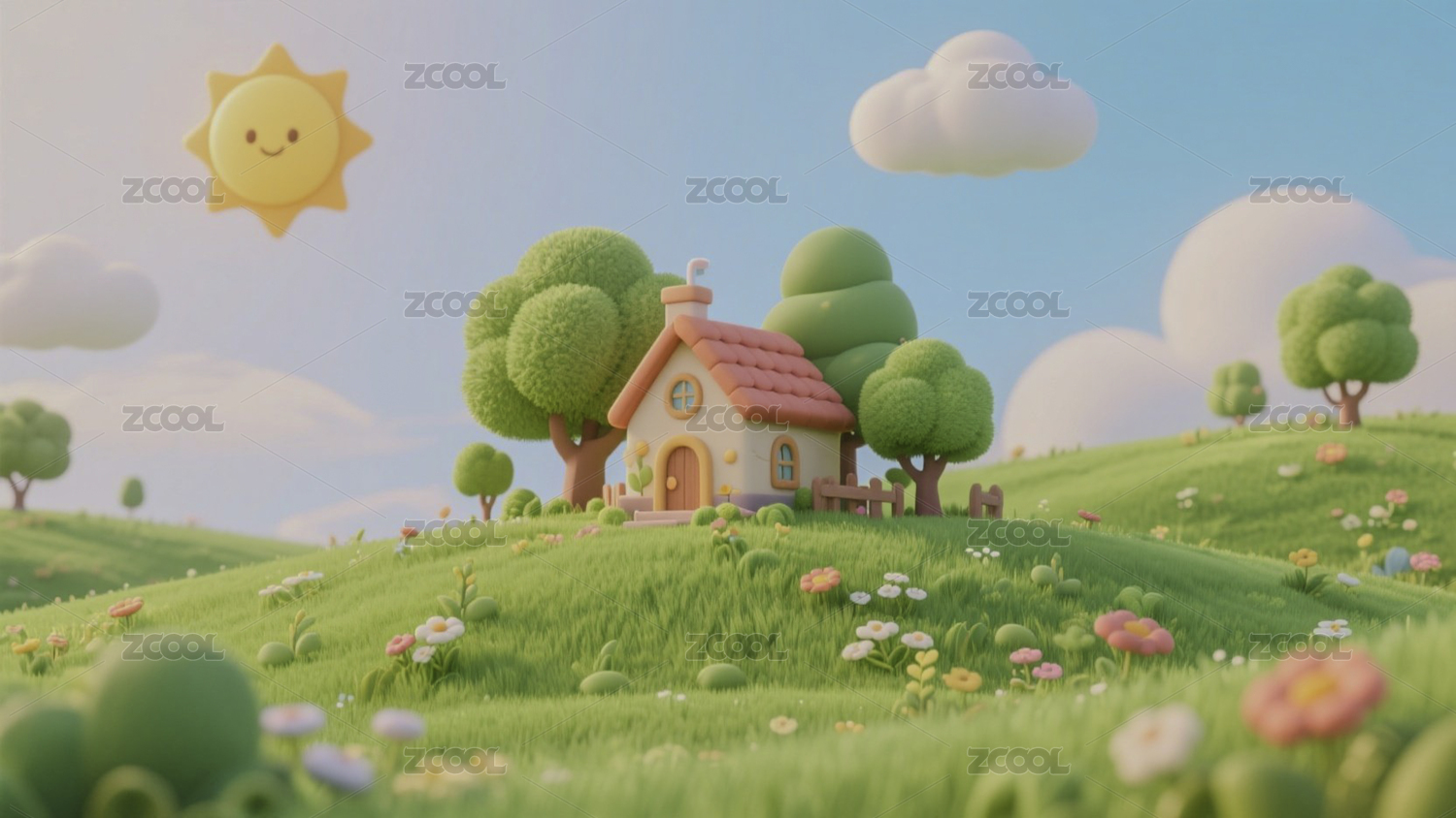 卡通小屋,小女孩,草地,蘑菇,花朵,蝴蝶,白云,蓝天,童话世界,插画
