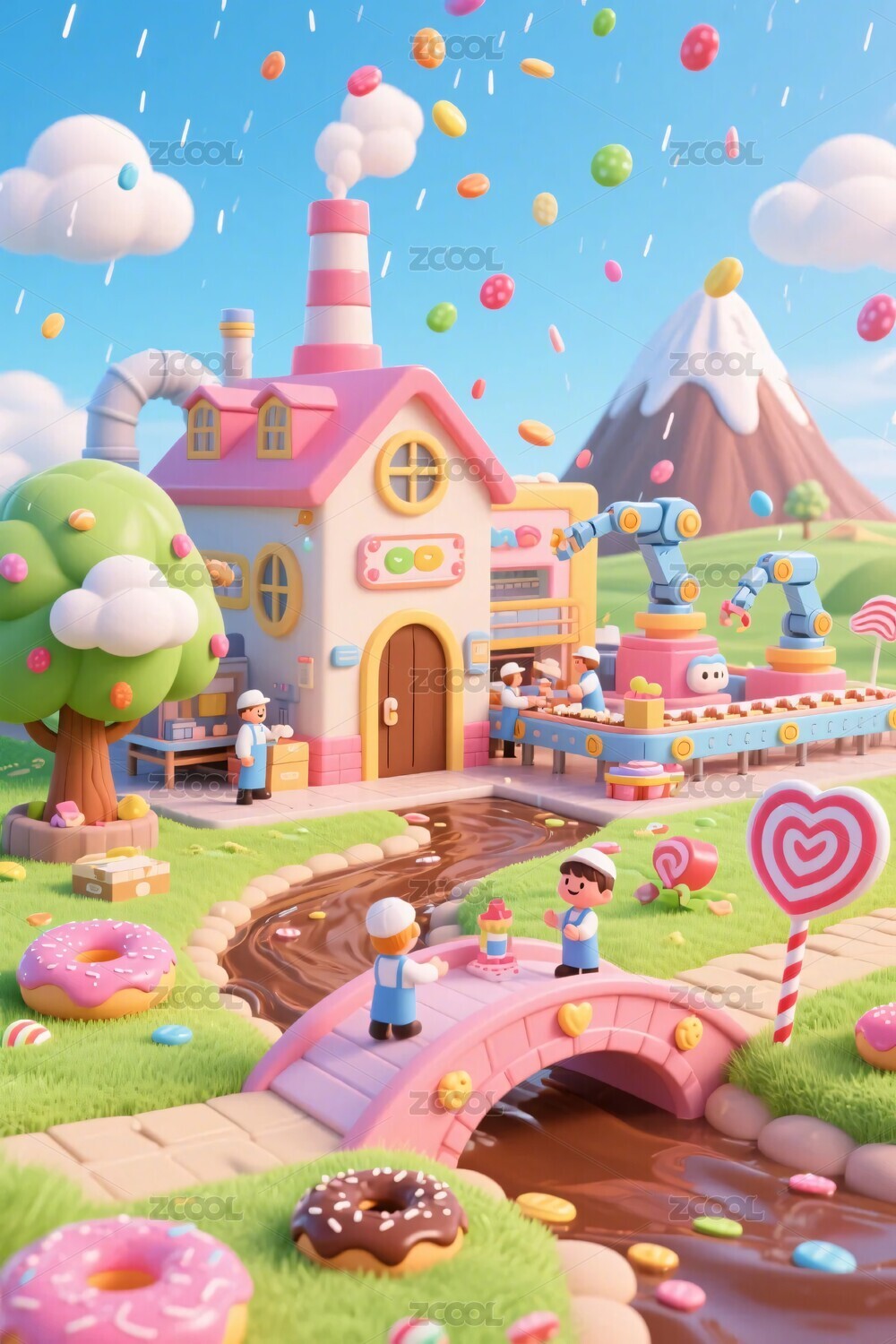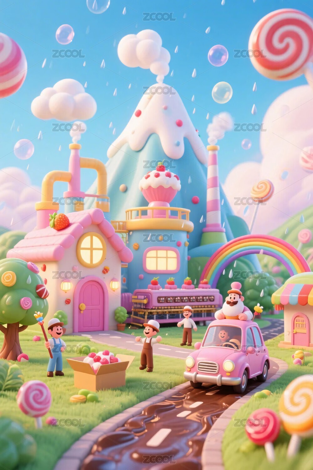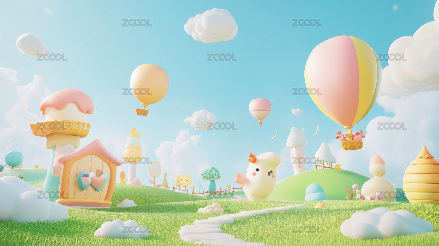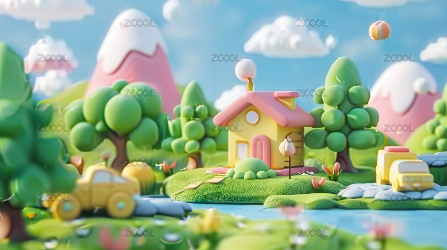卡通小屋,小女孩,草地,蘑菇,花朵,蝴蝶,白云,蓝天,童话世界,插画