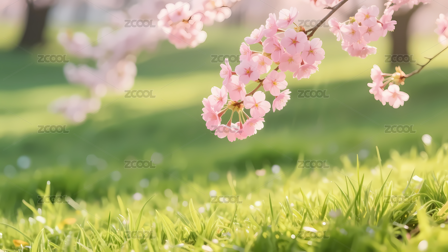 背景,绿色,粉色,蓝天,白云,草地,清新,樱花,树,盛开