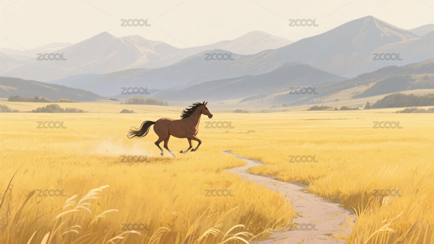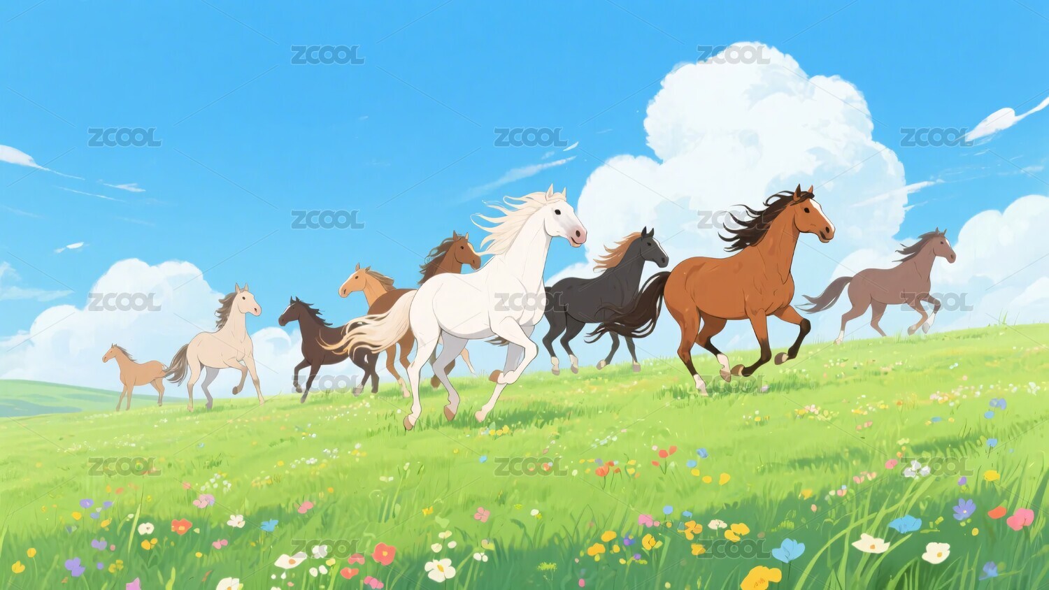 草原,骏马,奔跑,蓝天白云,山脉,插画,风景,自然,动物,画面元素