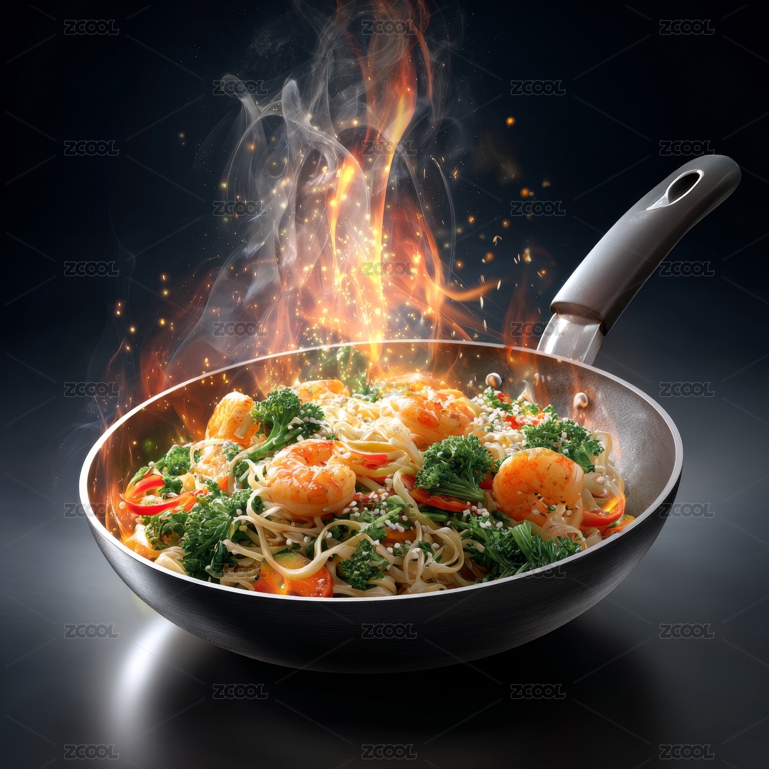 画面,黑色,白色,橙色,锅,食物,虾,蔬菜,米饭,火焰
