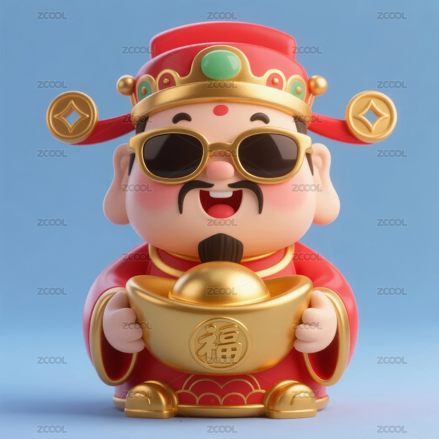 财神,粉色服饰,卡通形象,墨镜,手持金元宝,传统元素,创意设计,财神爷,3D