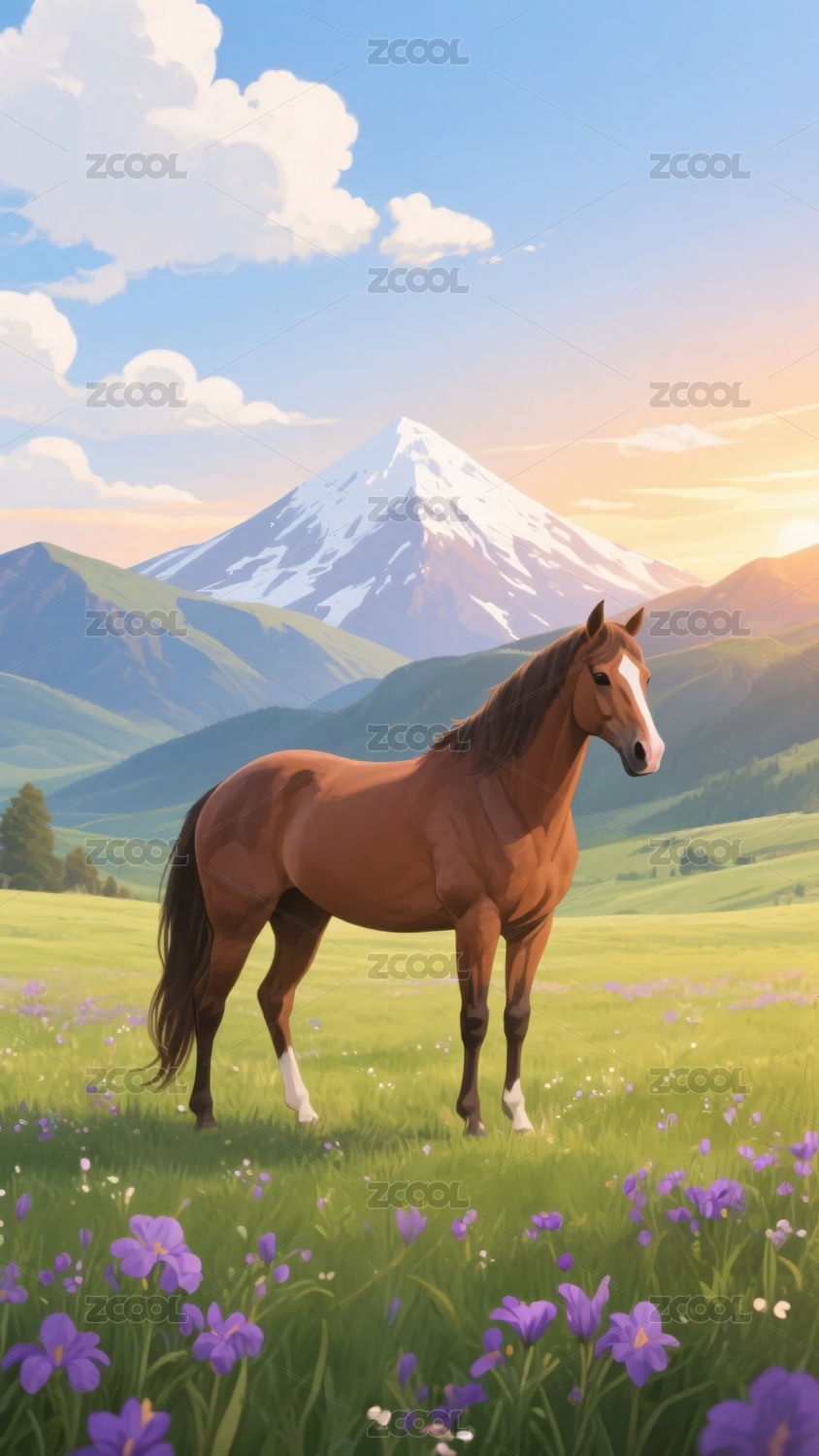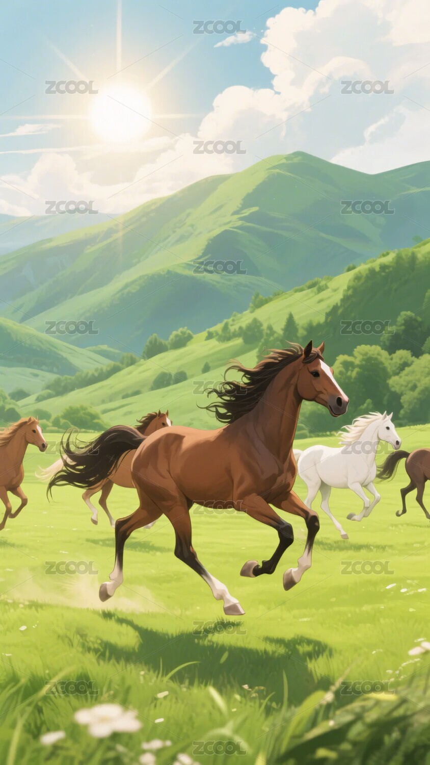 阳光下草原上的骏马插画