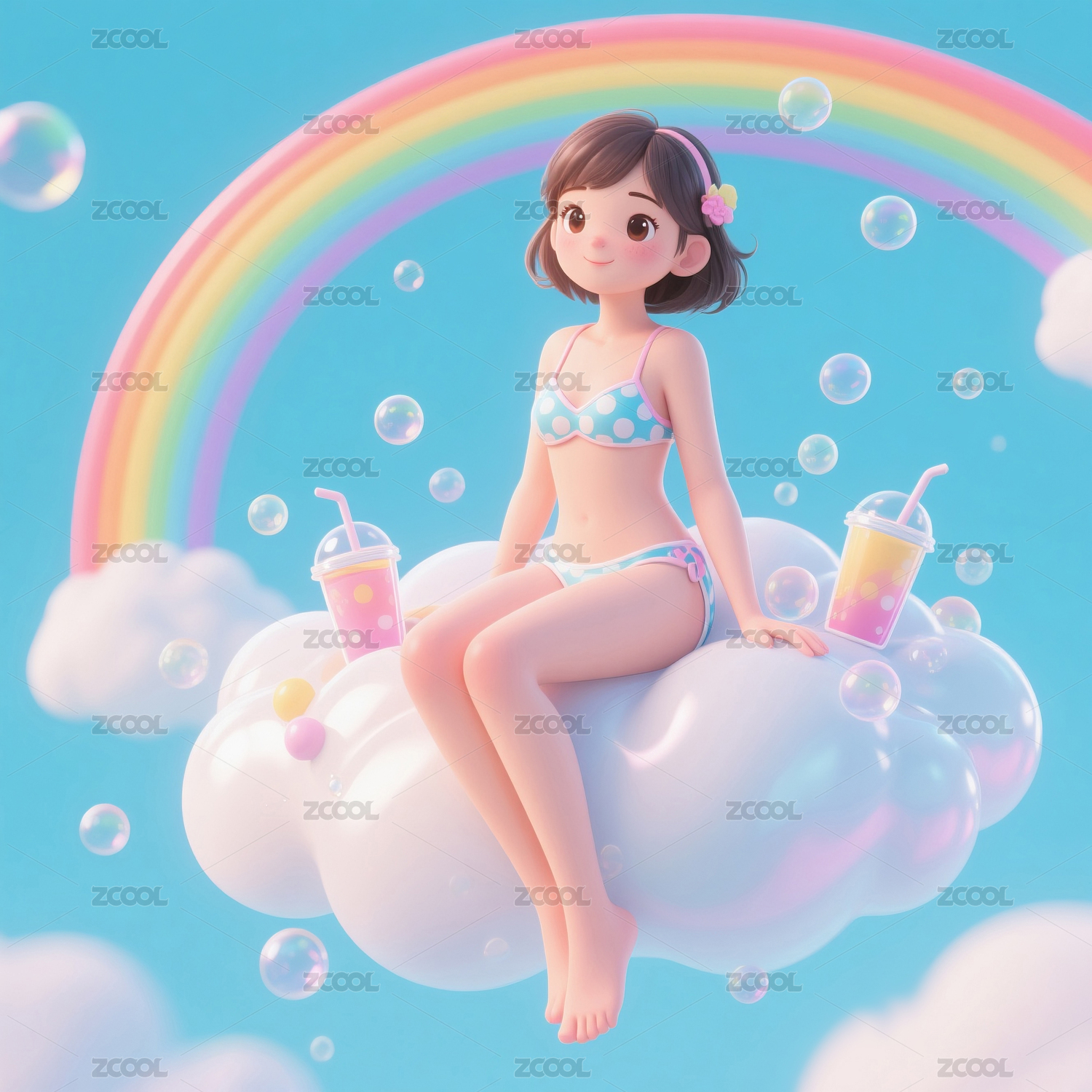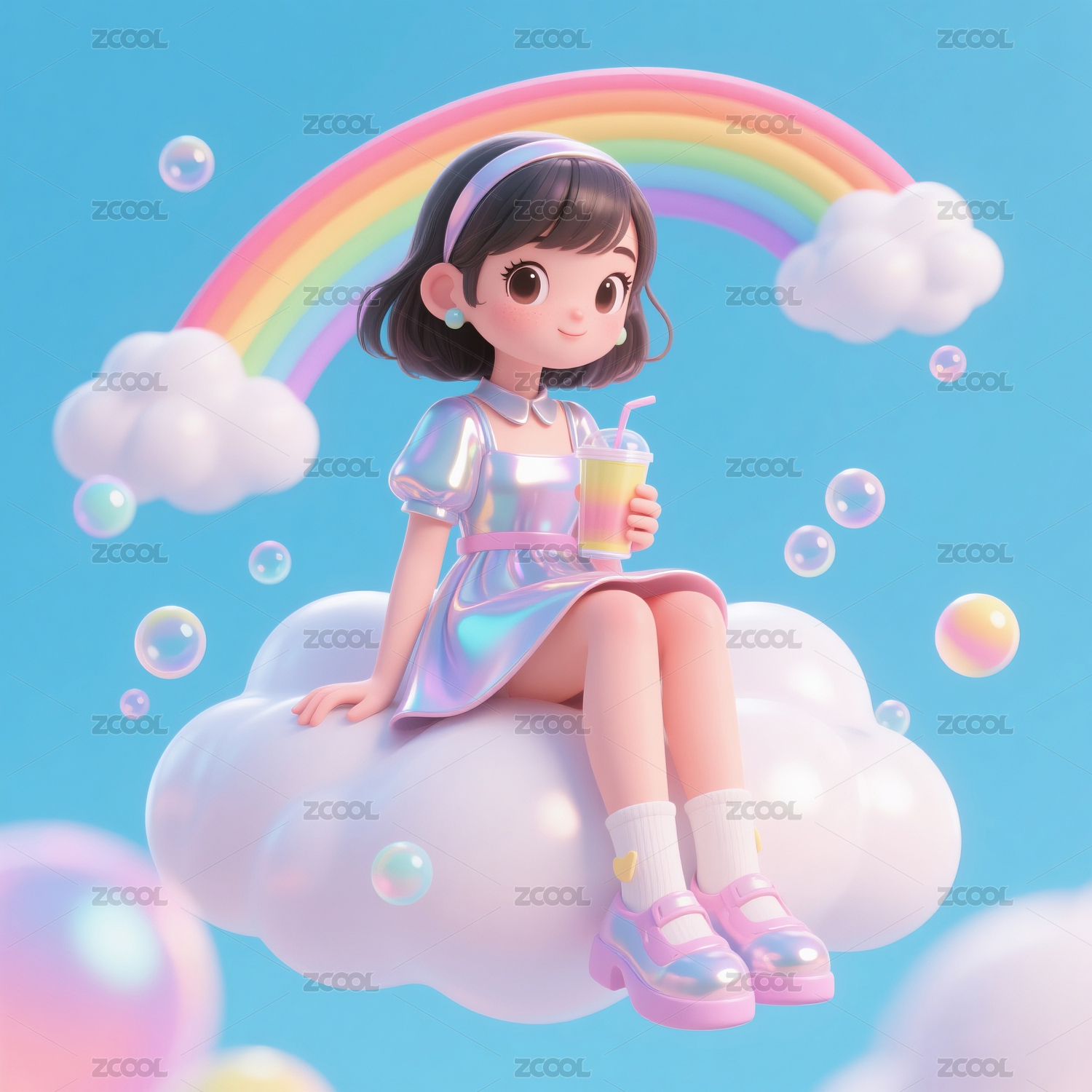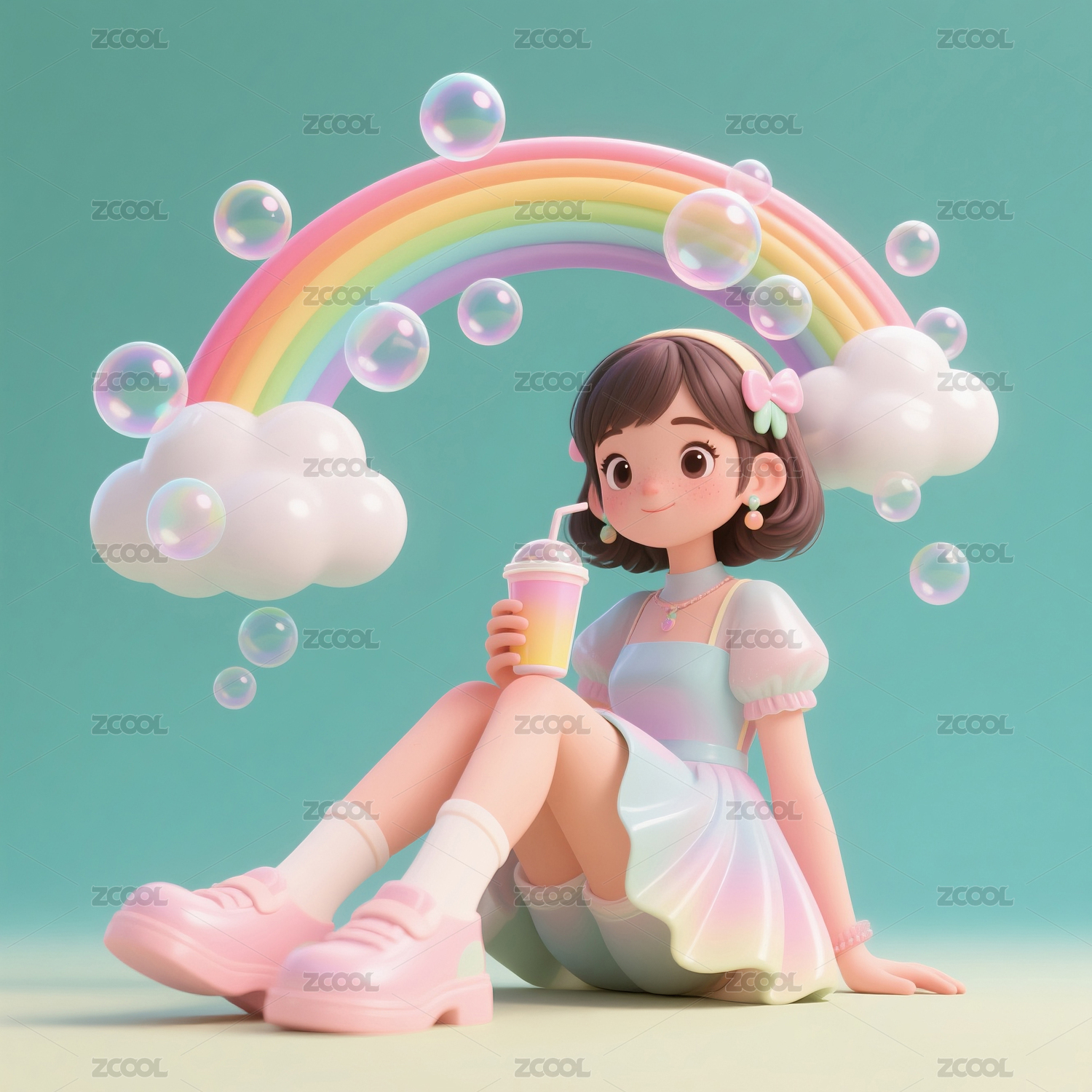 彩虹,云朵,白云,泡泡,可爱,萌萌哒,喝软饮,拿软饮,软饮,女孩