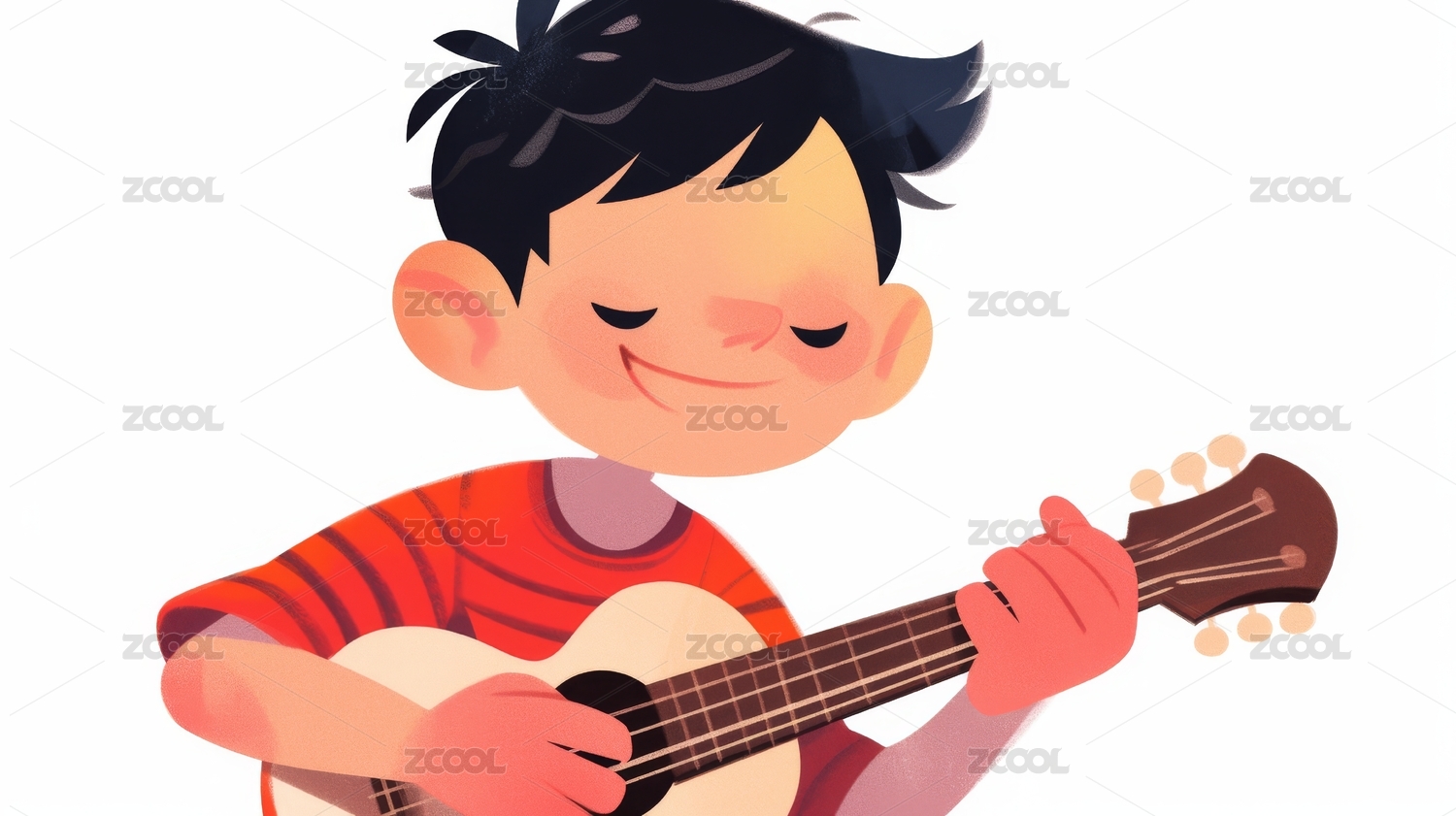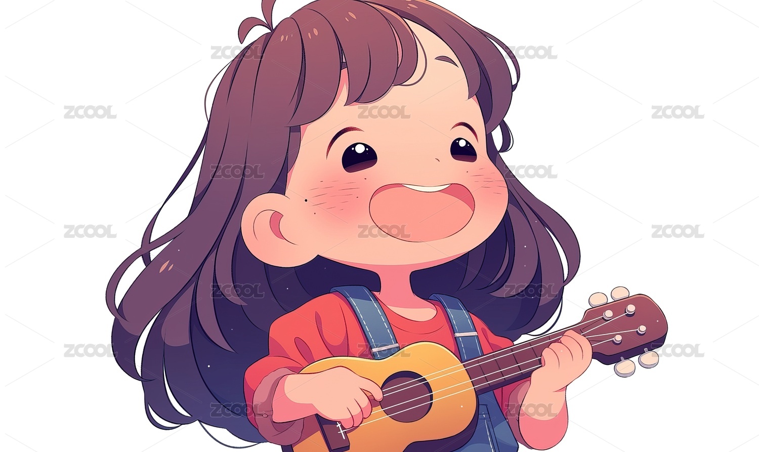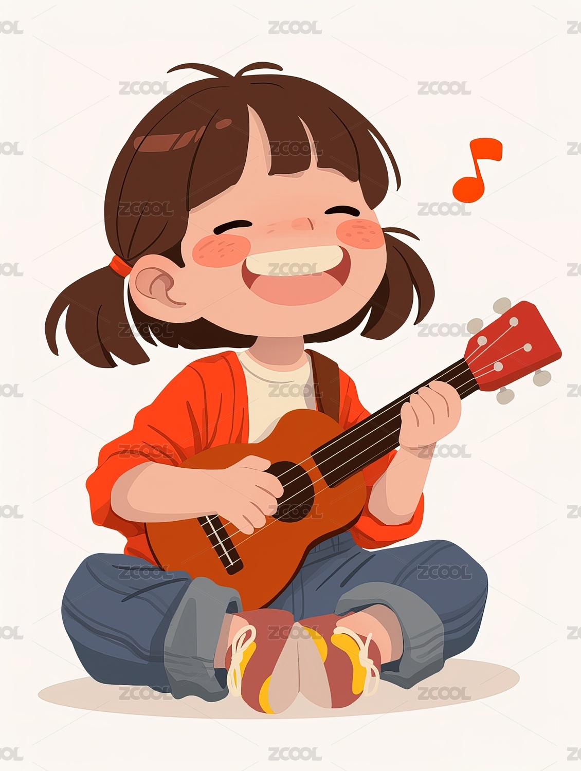 可爱卡通女孩弹奏尤克里里,温馨插画风格,
