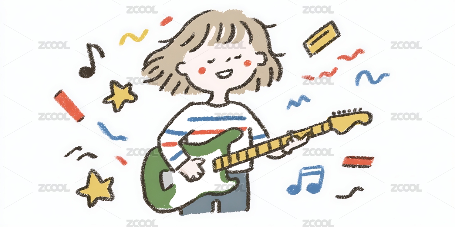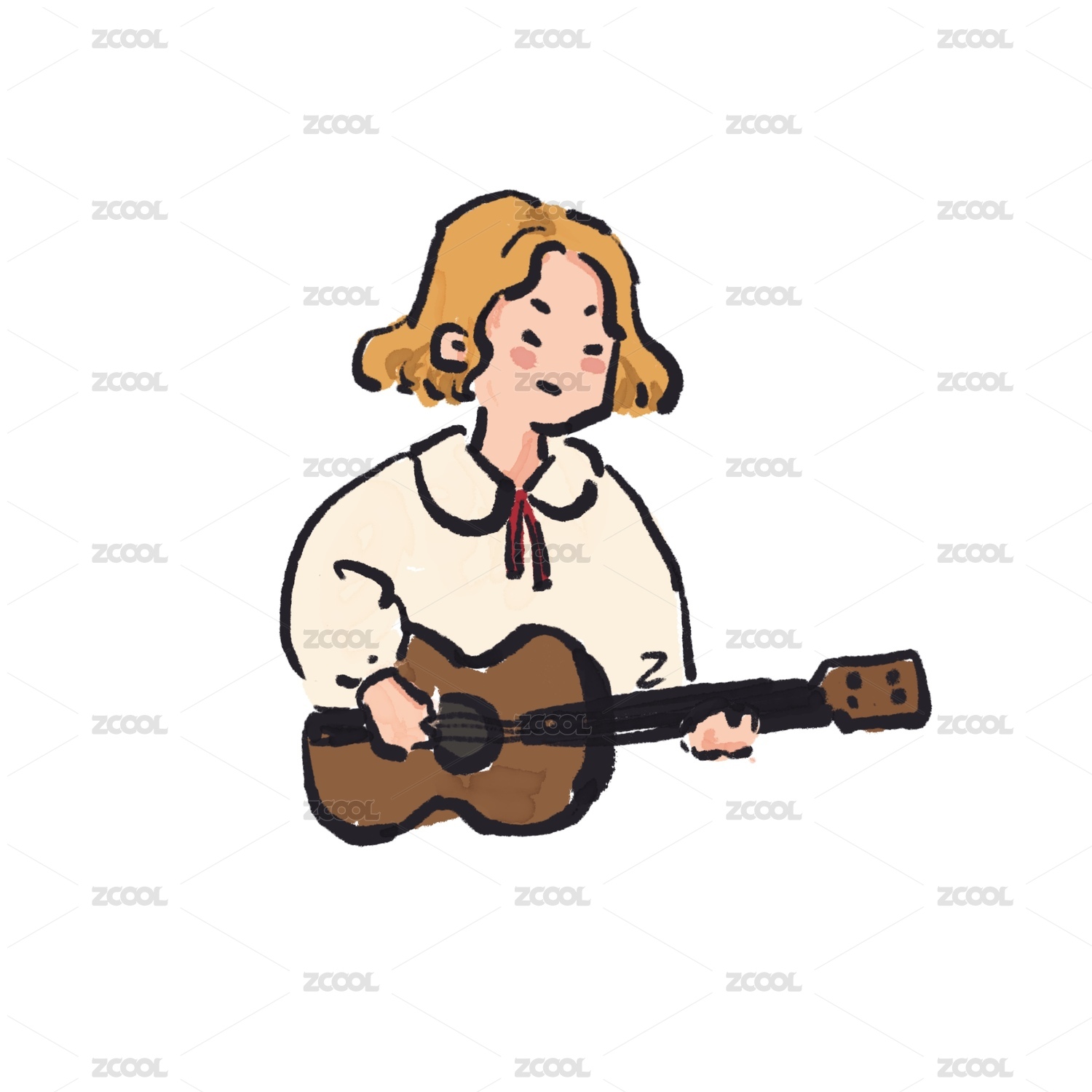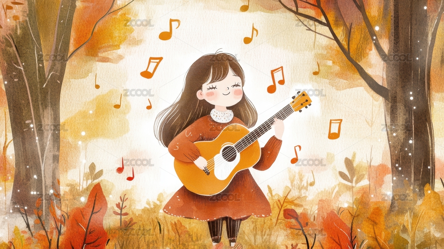 可爱卡通女孩弹奏尤克里里,温馨插画风格,