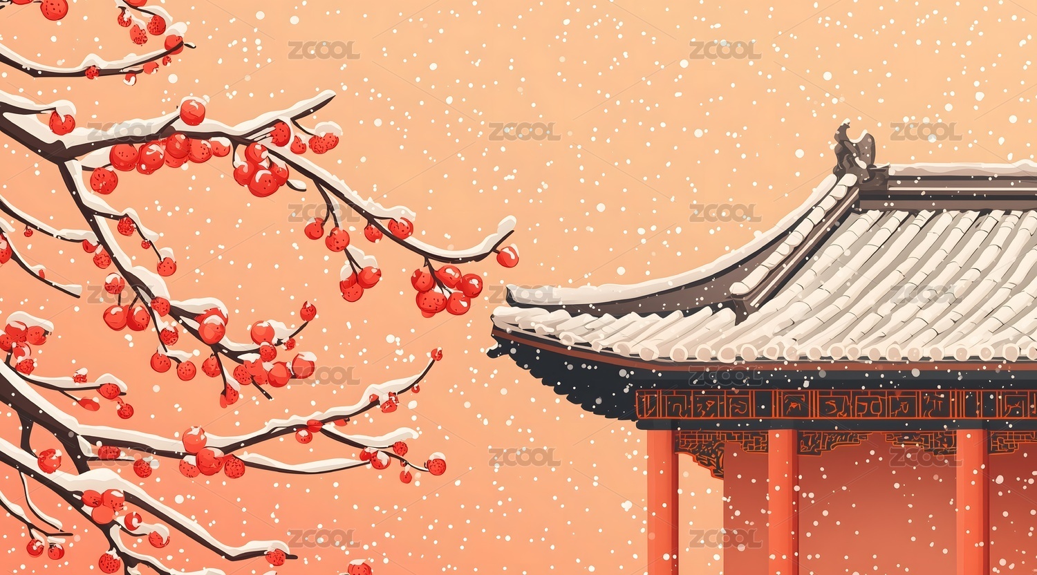 冬季雪梅雪景古典建筑插画