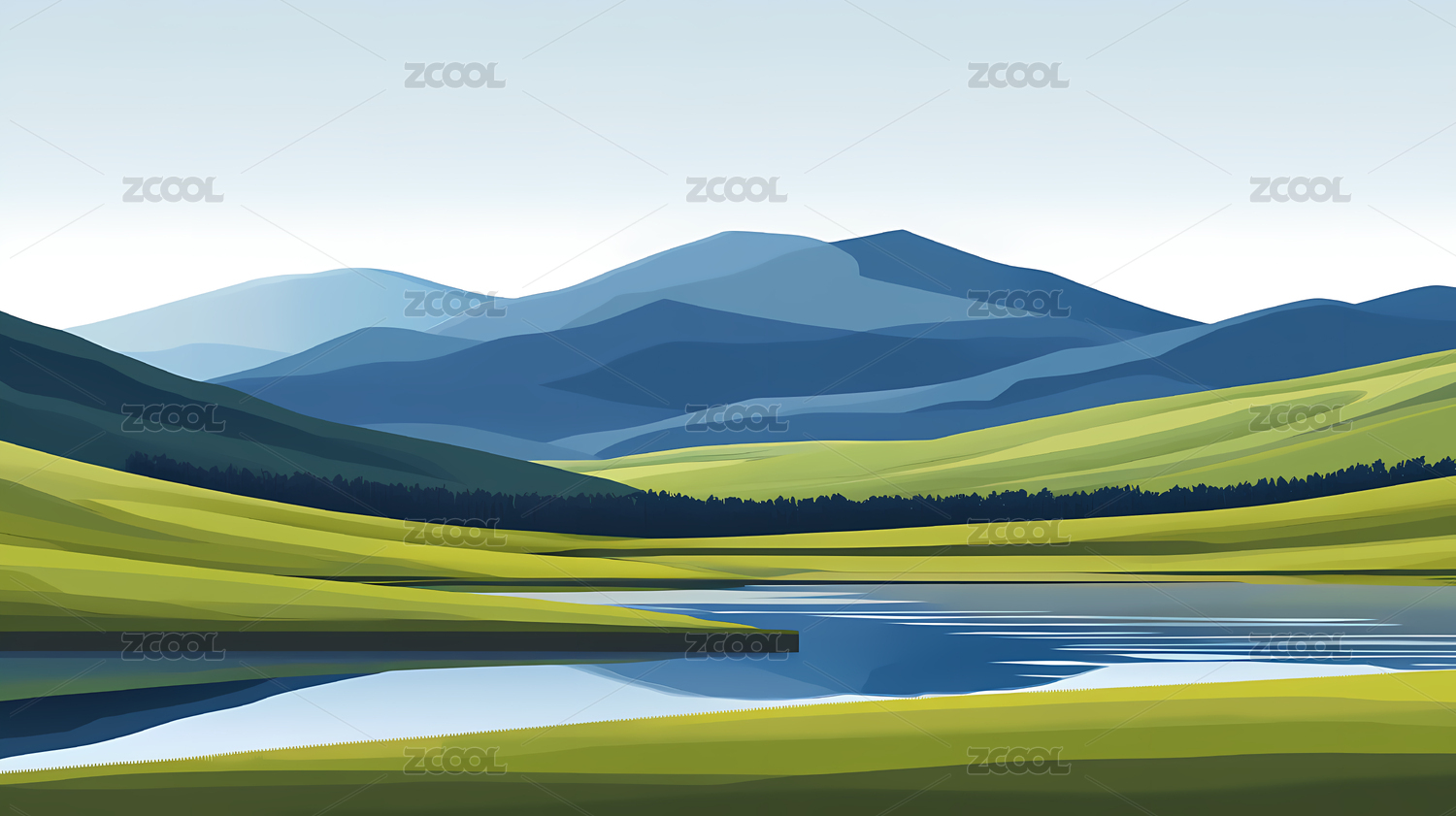 蓝天白云绿色草地湖泊卡通动漫背景插画壁纸