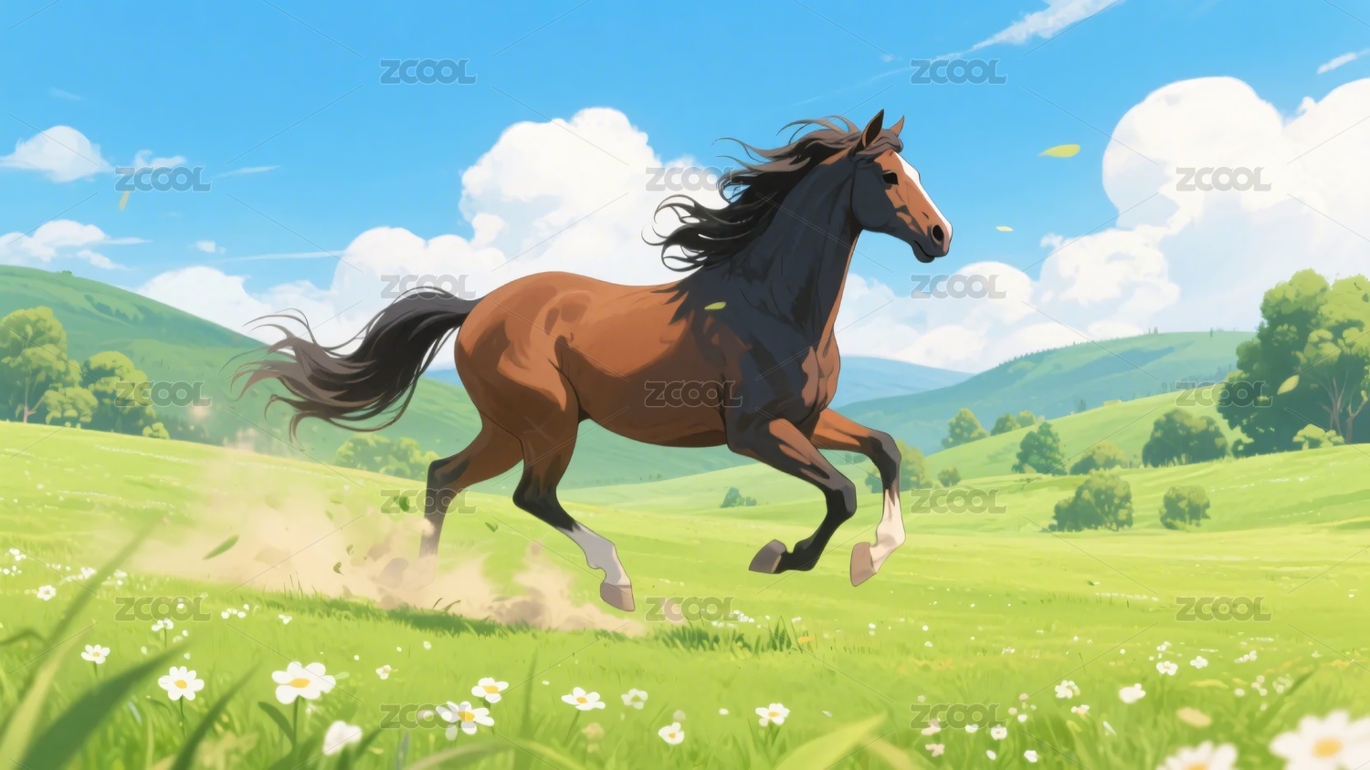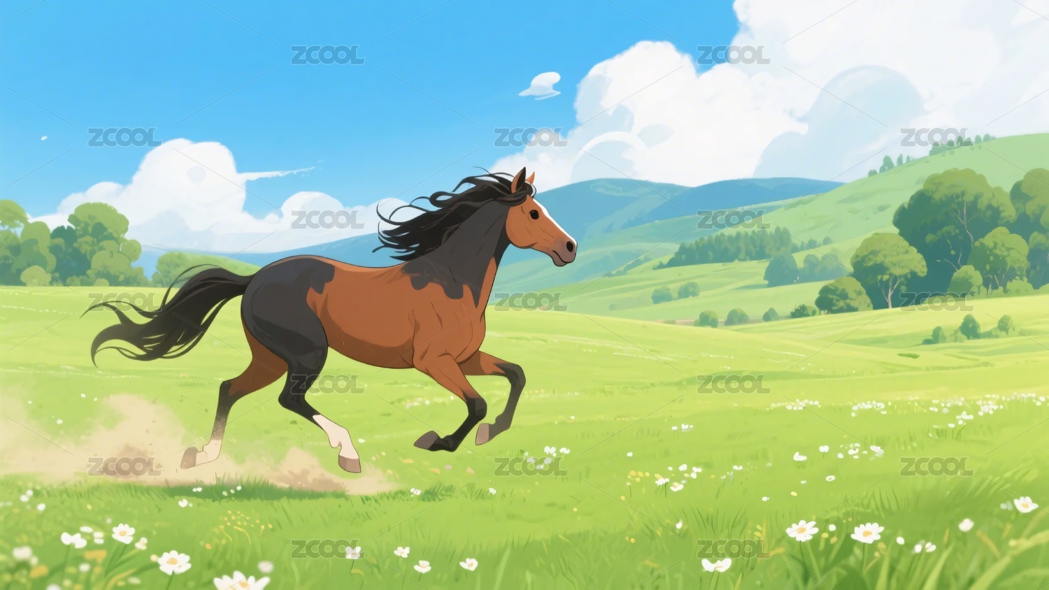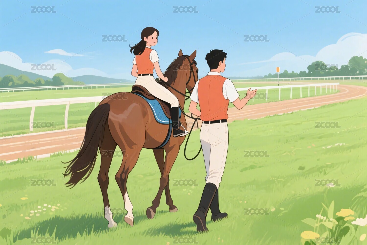 插画中人物骑马驰骋于草地