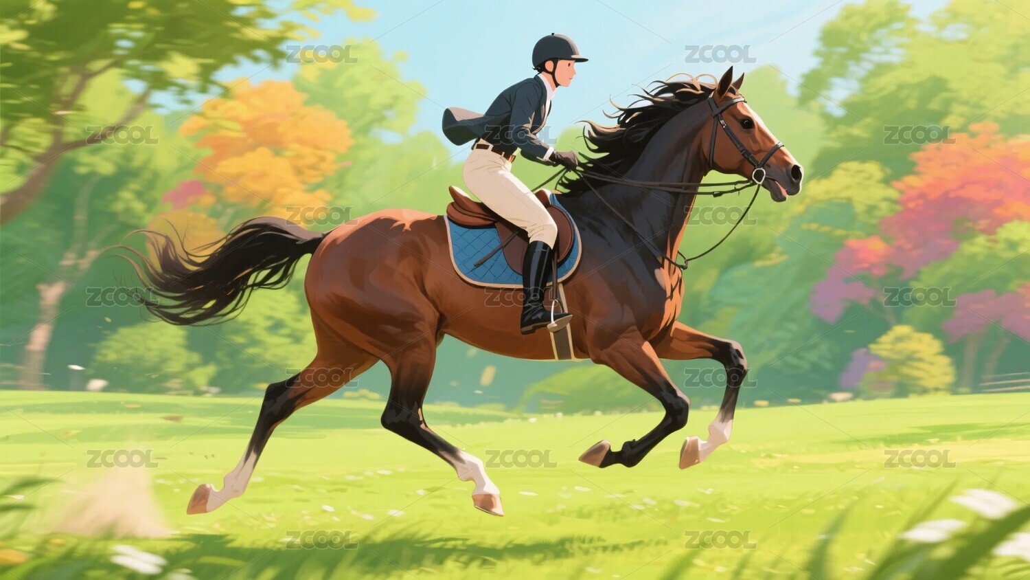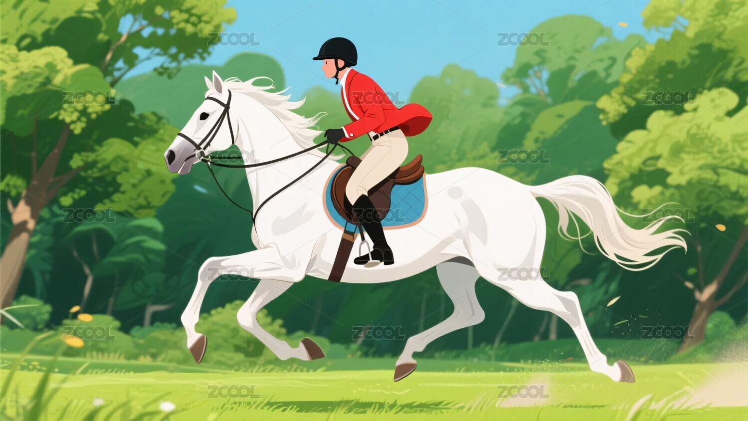 骑手,森林,草地,奔跑,插画,运动,自然,人物,动物,风景