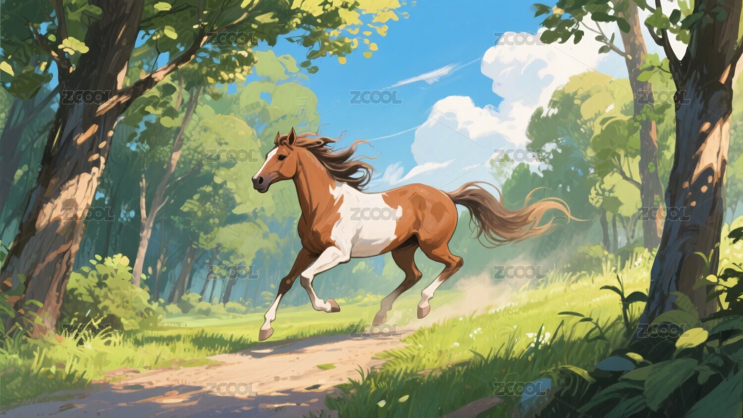 林间奔跑的棕白骏马
