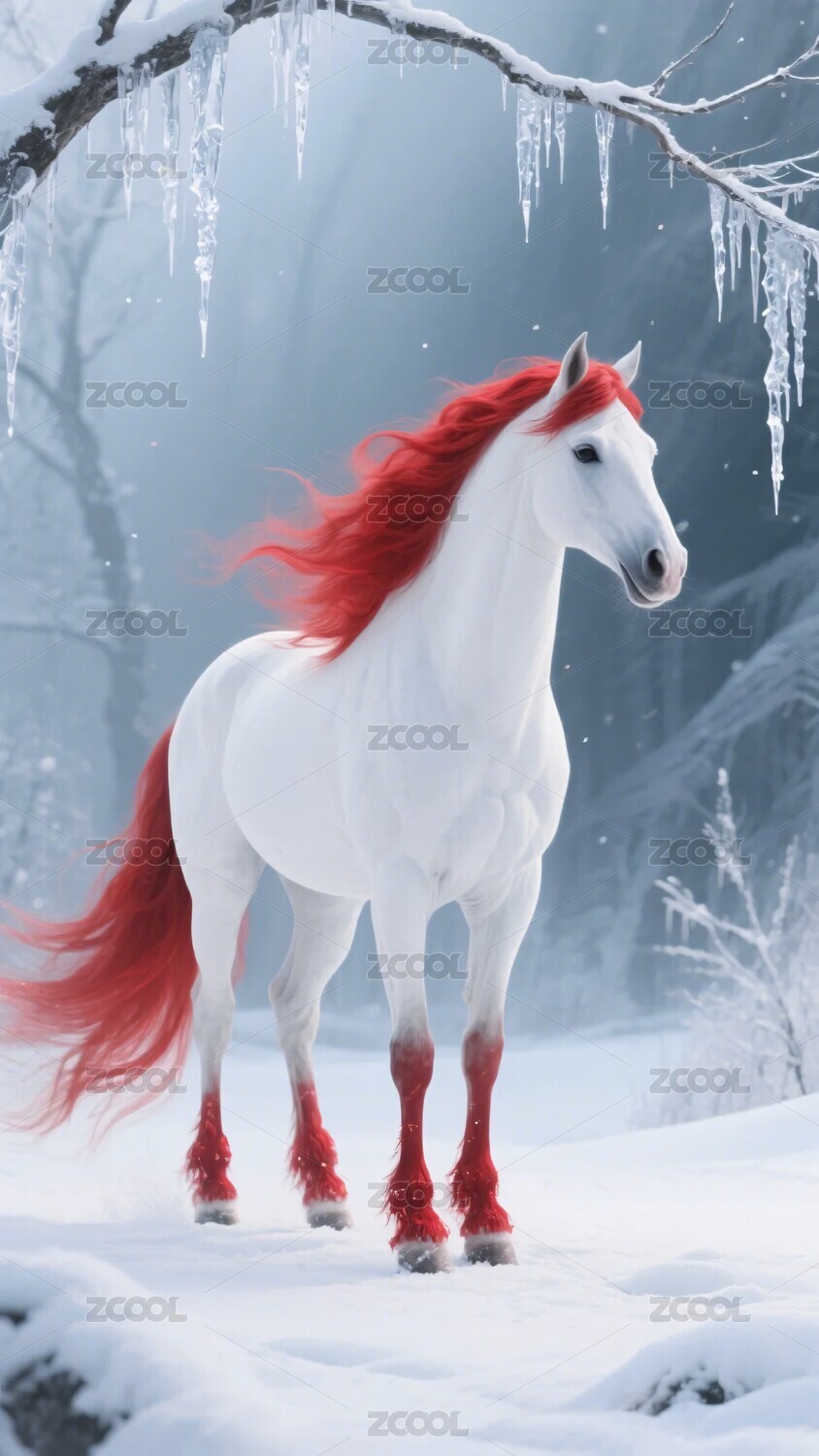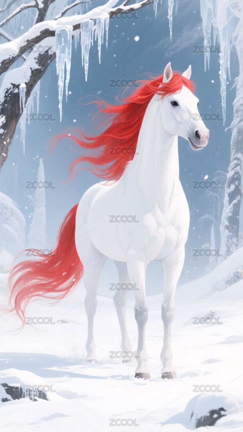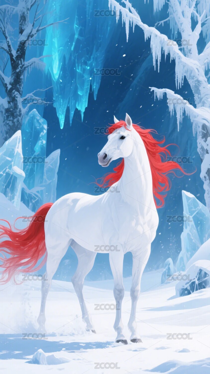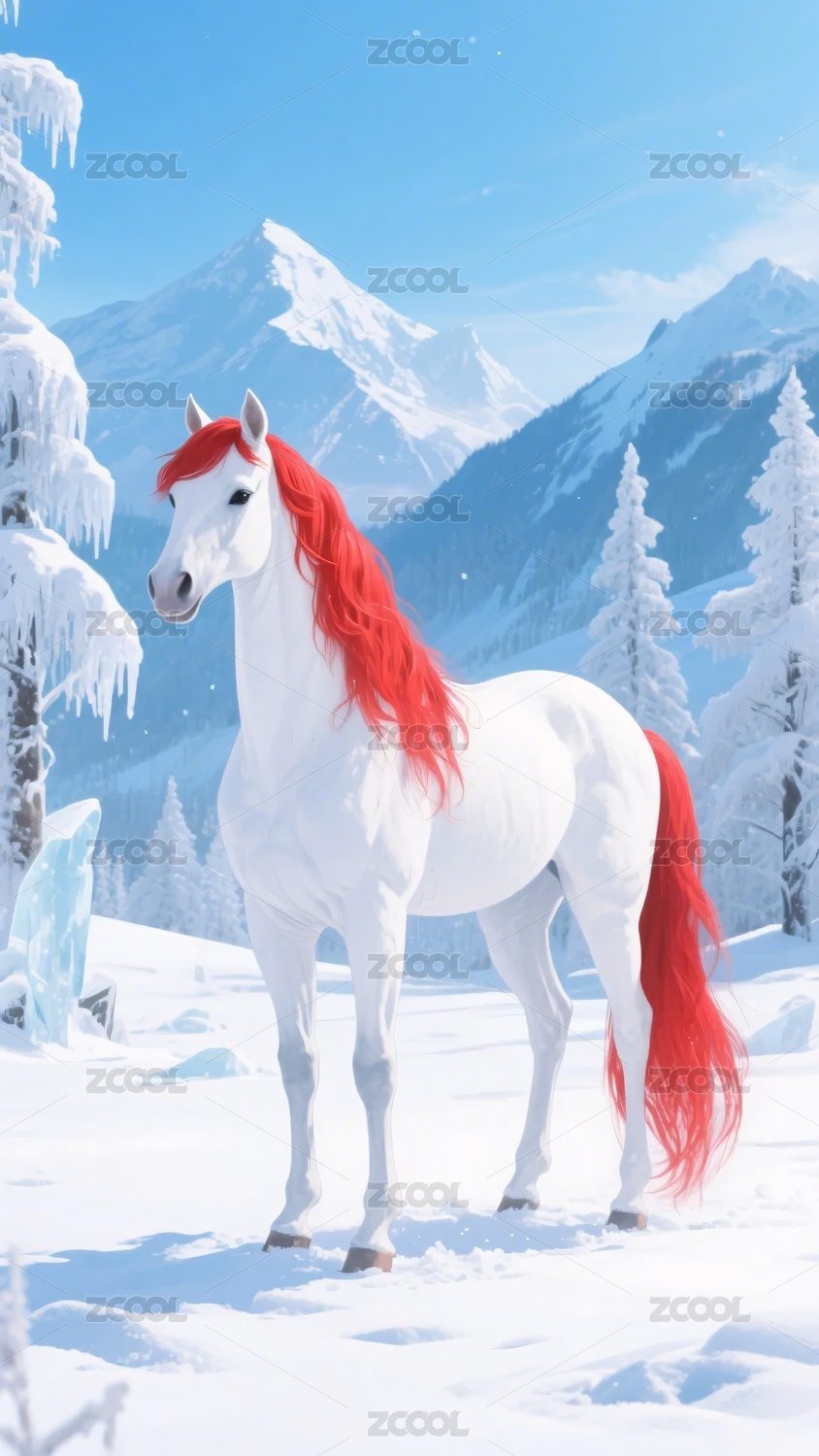 骏马,雪地,红鬃毛,奇幻,插画,冰雪,山峰,飘带,元素,幻想