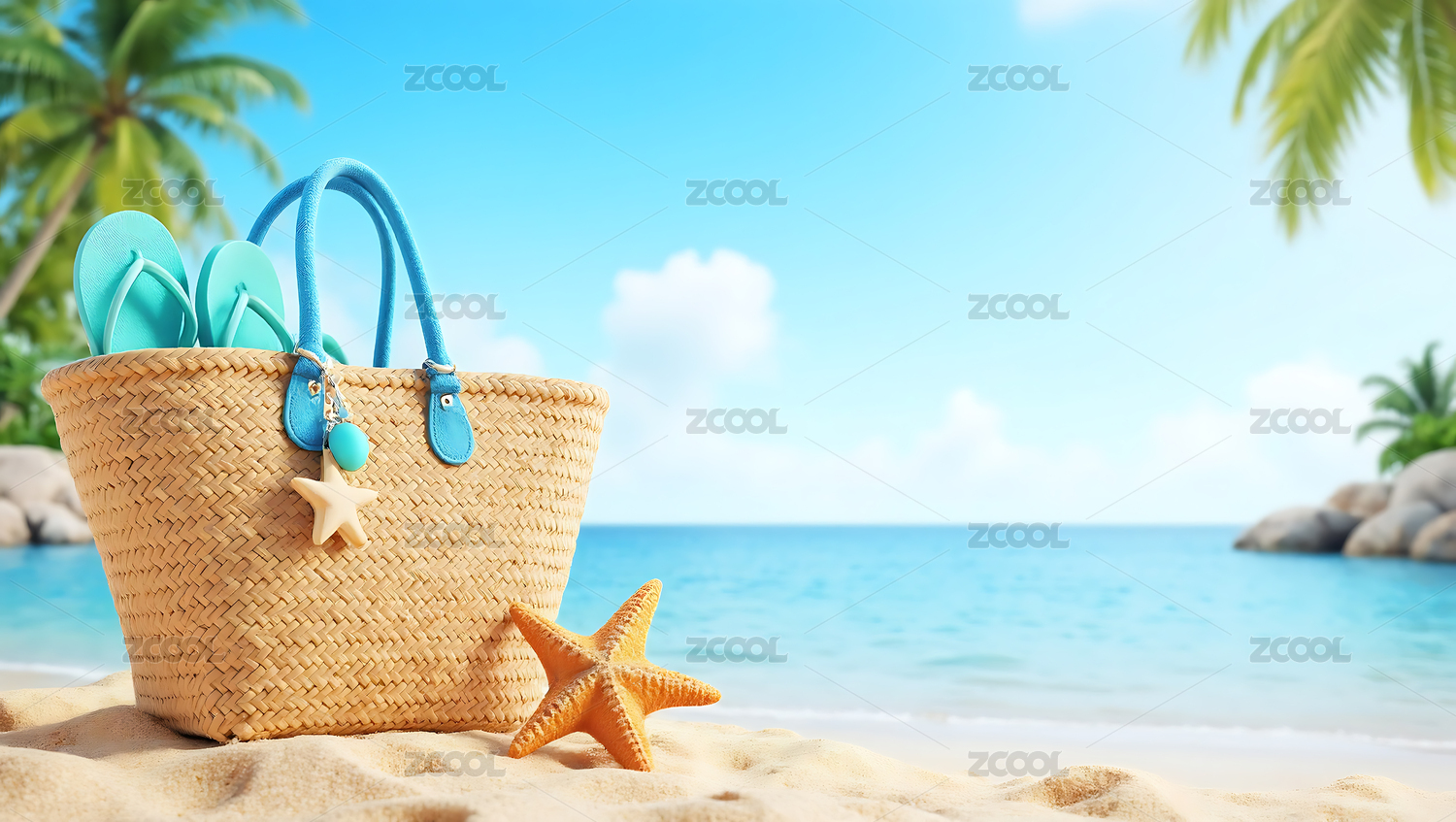 沙滩度假编织包与海星