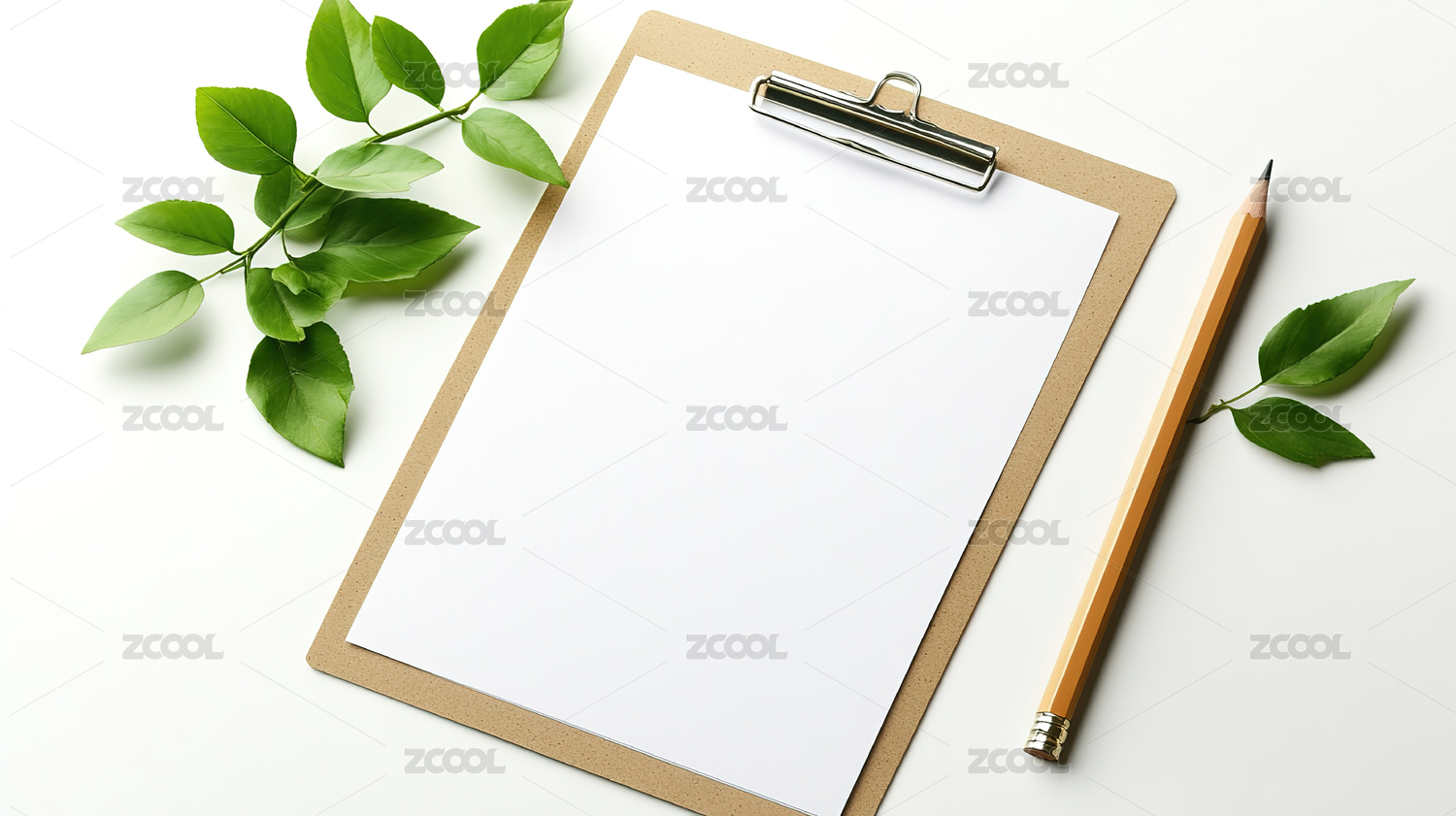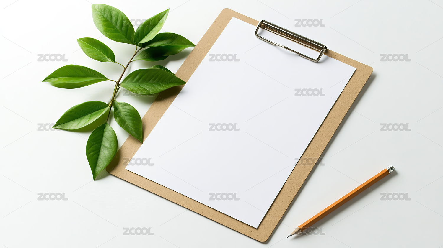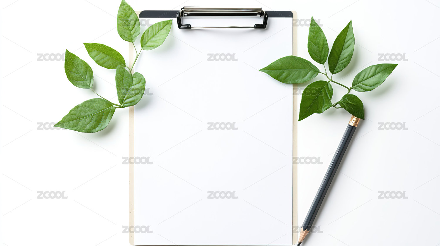 翻开的笔记本放在绿色枝叶中间,白色背景