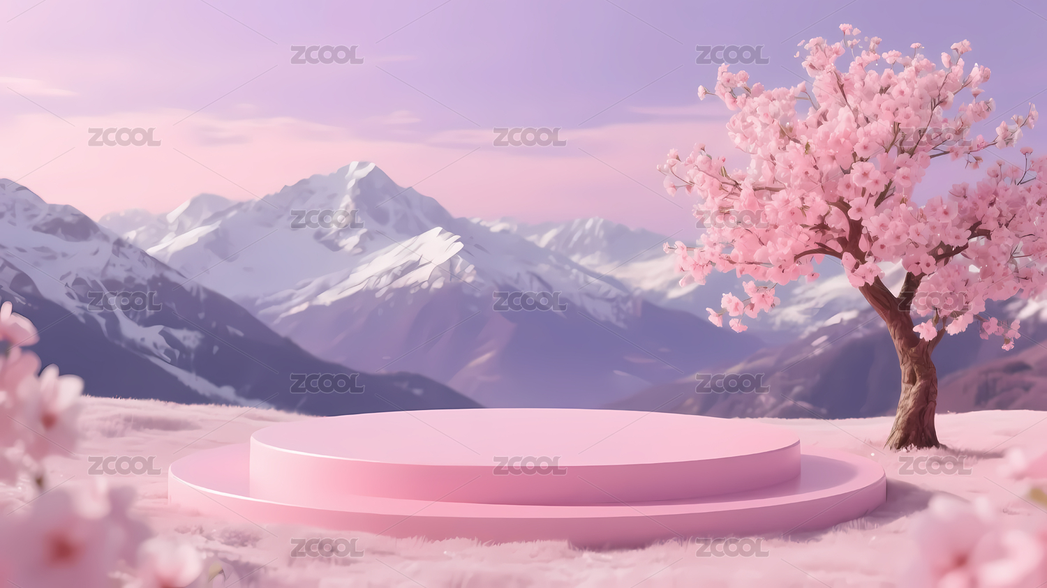 梦幻樱花与雪山