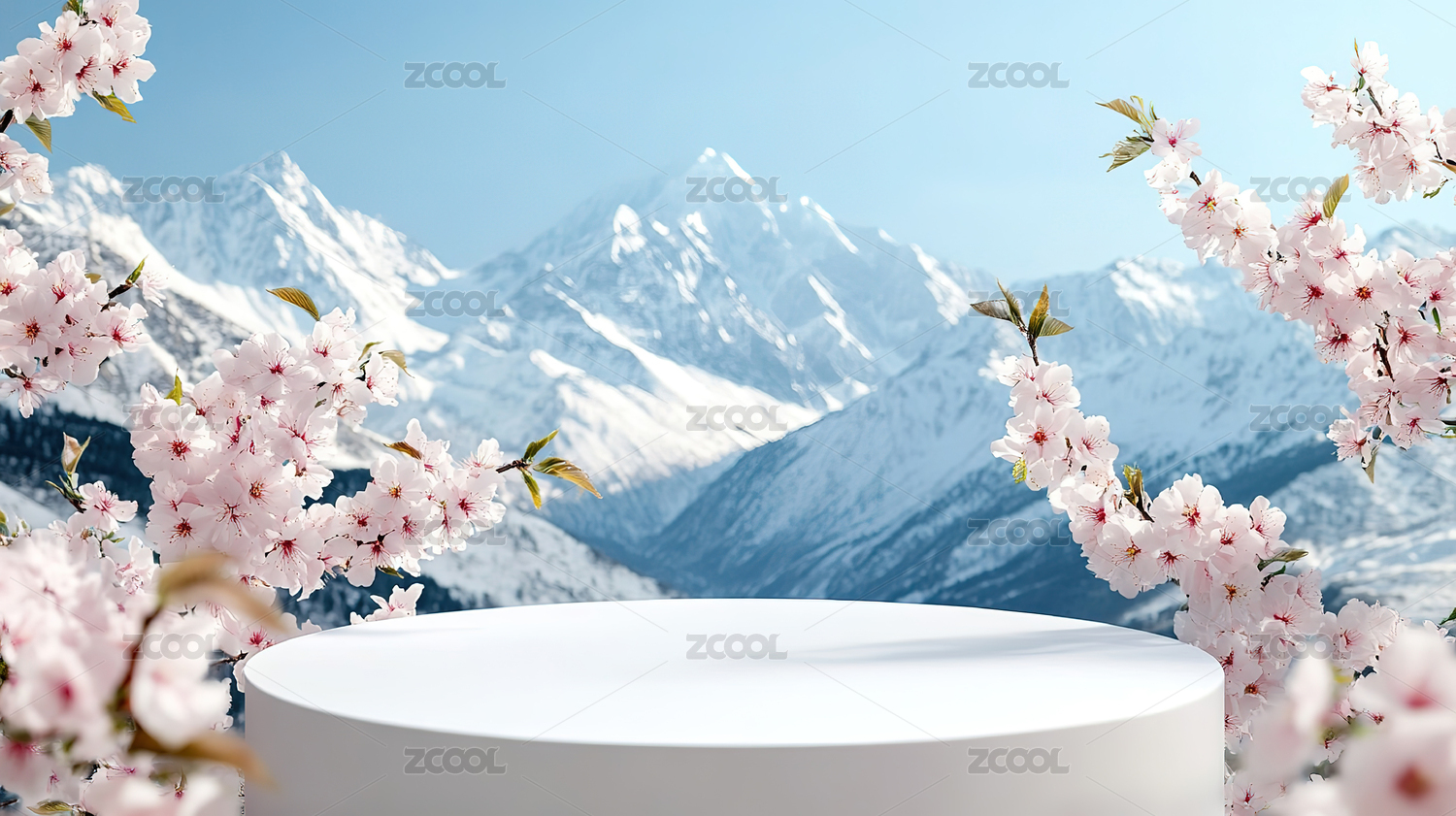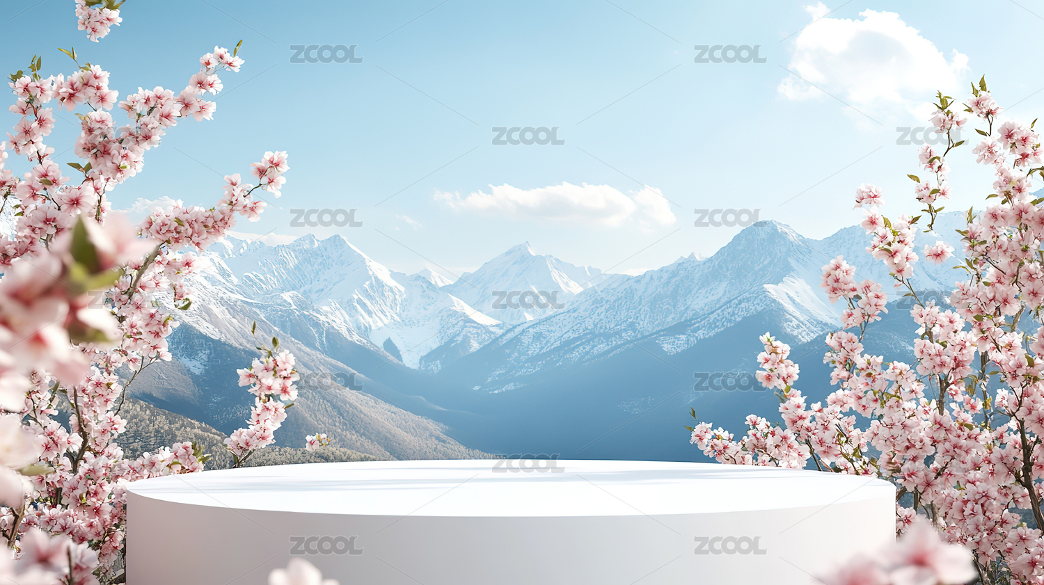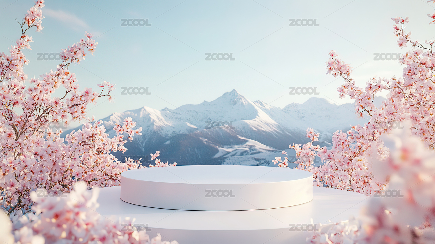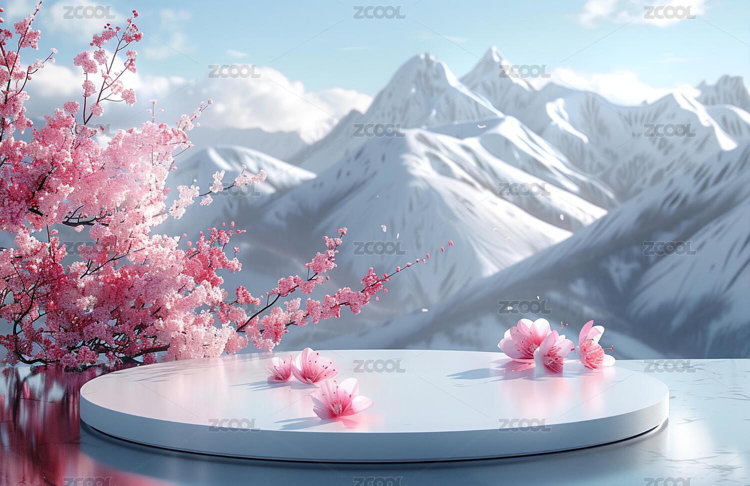 春日樱花盛开下的白色圆形展台