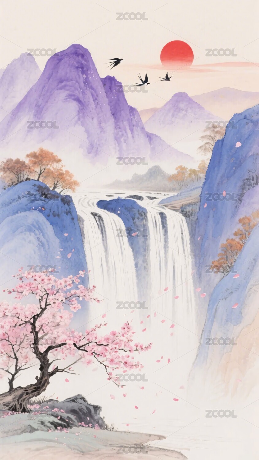 山水,瀑布,樱花,飞鸟,红日,自然,风景,插画,国风,唯美