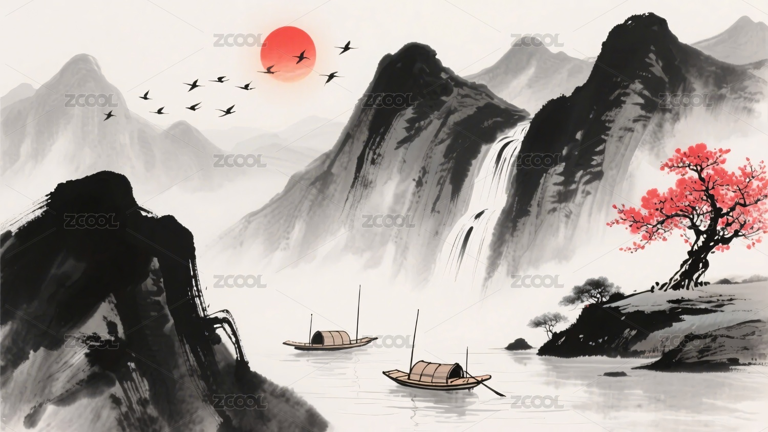 水墨山水间的孤舟与飞鸟