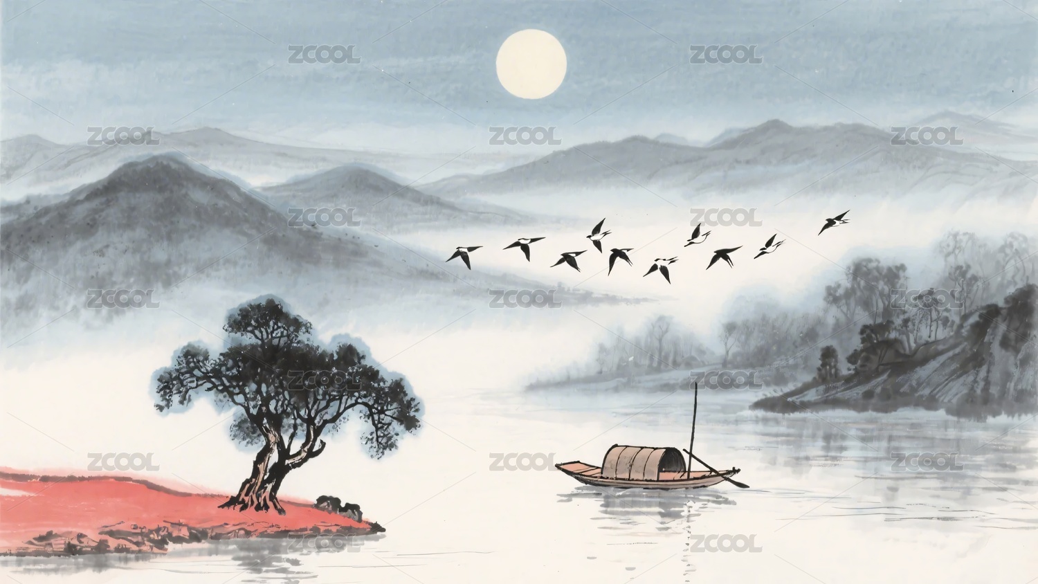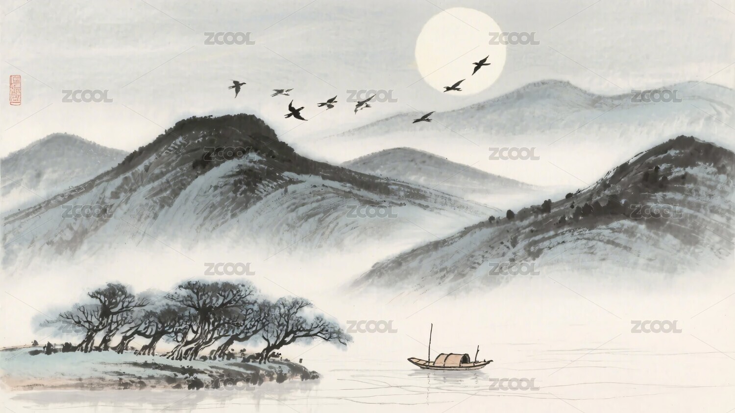 山水,月亮,飞鸟,孤舟,水墨画,插画,自然,景色,中式,意境