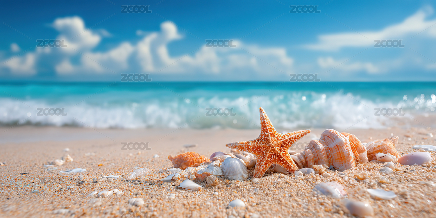 沙滩,沙粒,阴影,海星,波纹,贝壳,海螺,海浪,浪花,海岸线