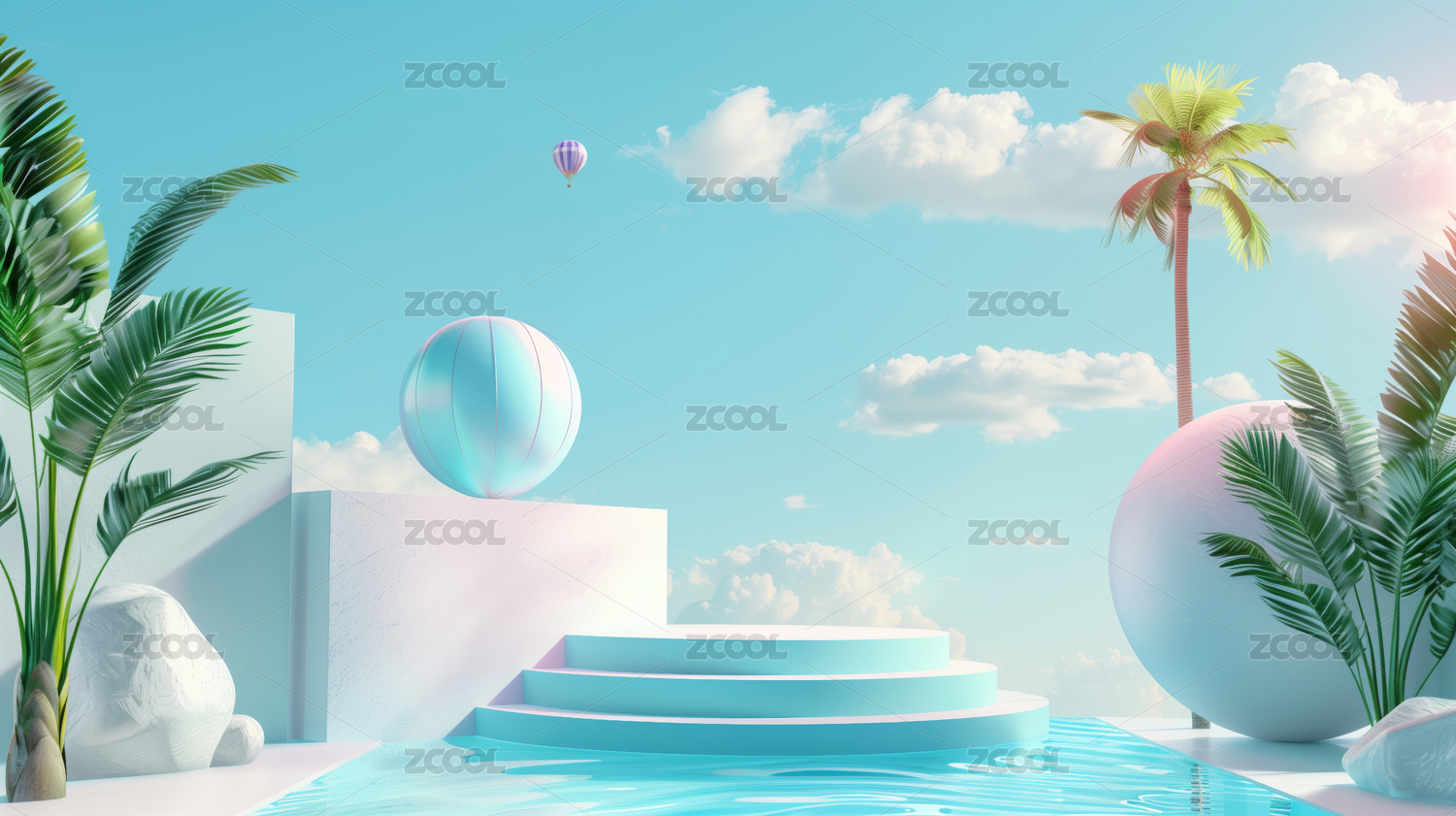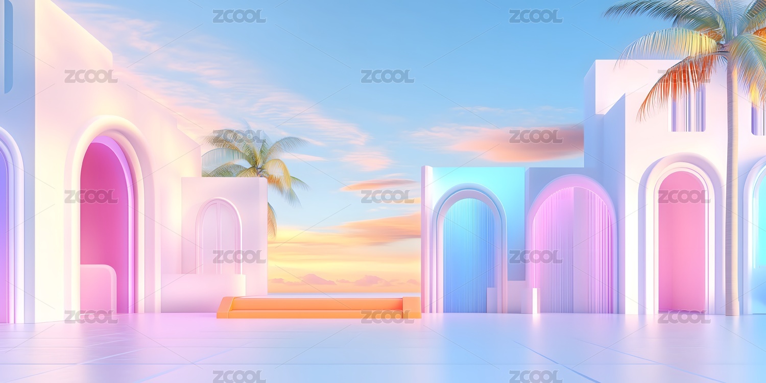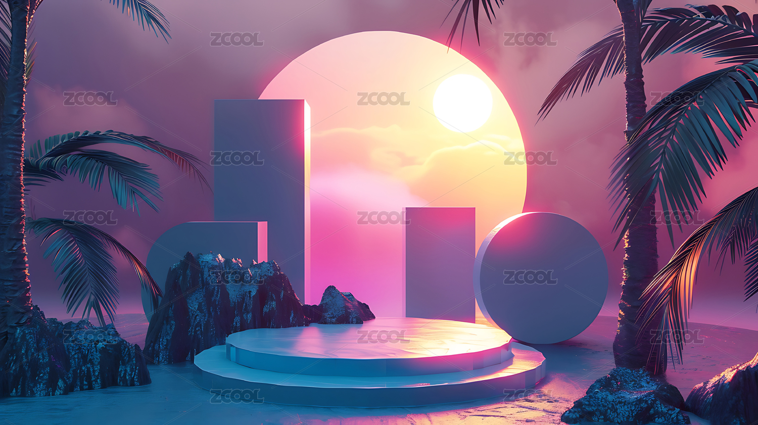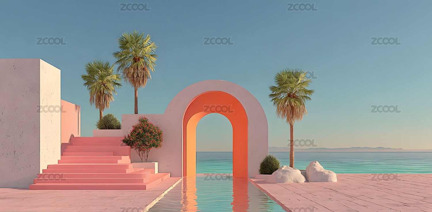 海滨,几何,场景,插画,椰树,色彩,简约,创意,夏日,度假