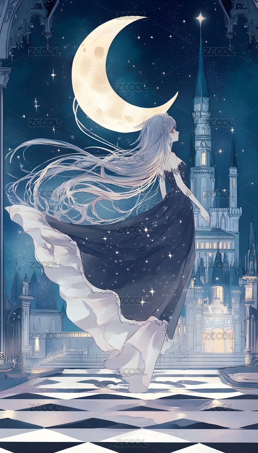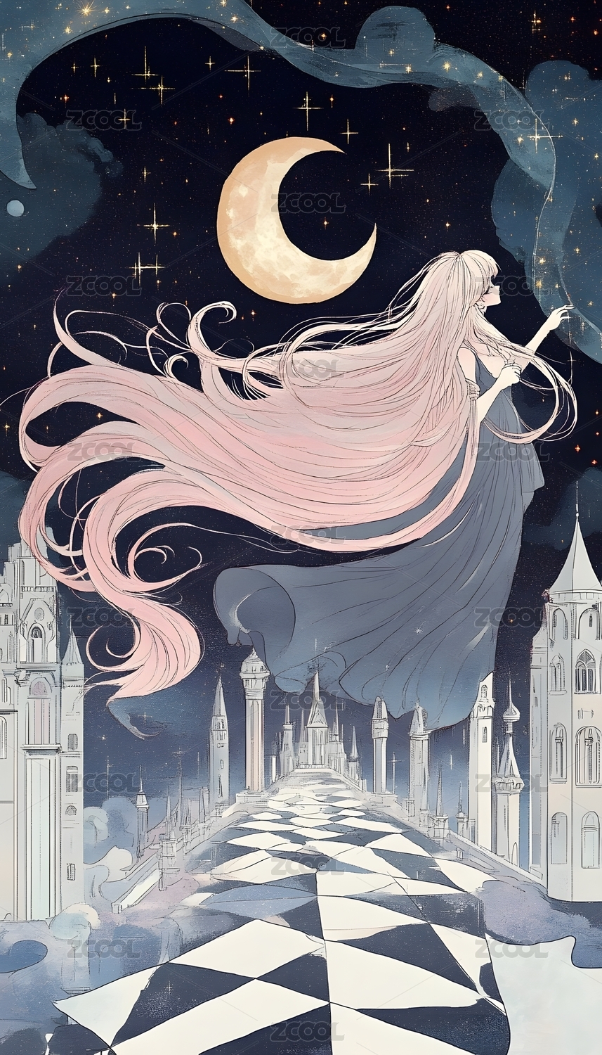 月下,长发少女,城堡,飞舞,插画,艺术,创意,色彩,丰富,梦幻