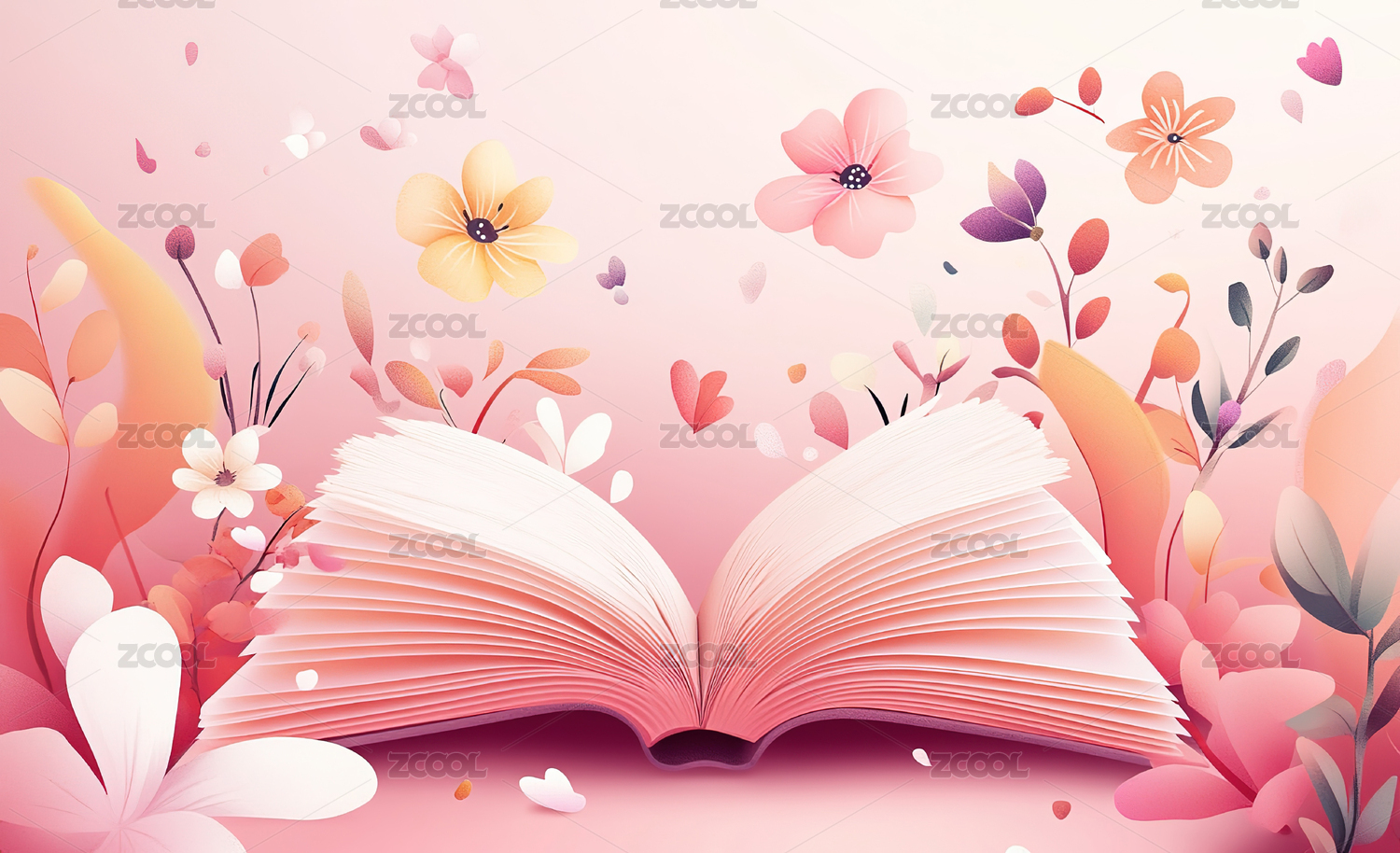 一本打开的书本周围盛开鲜花