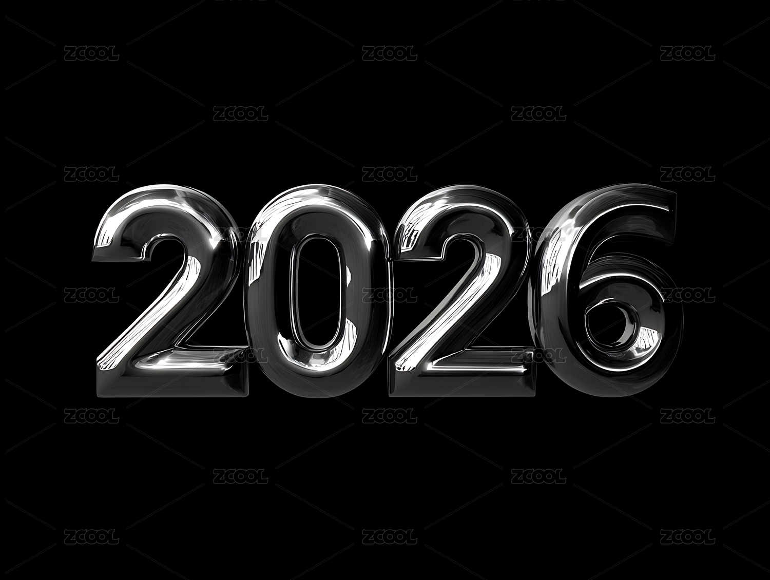 2026,马年,节日,数字,反光,金属,立体,黑色背景,质感,银色