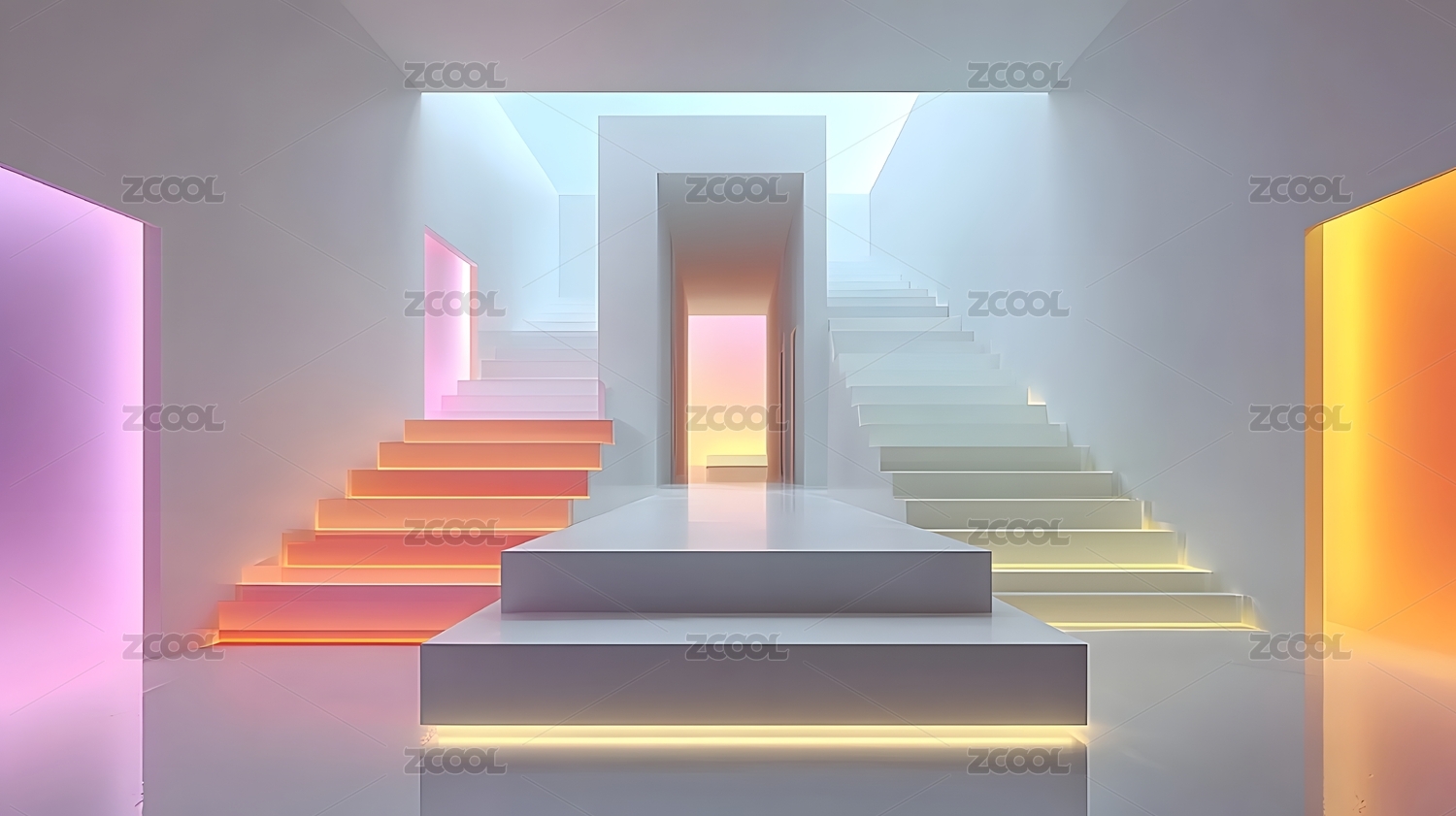 蓝色楼梯通向柔和光晕的走廊