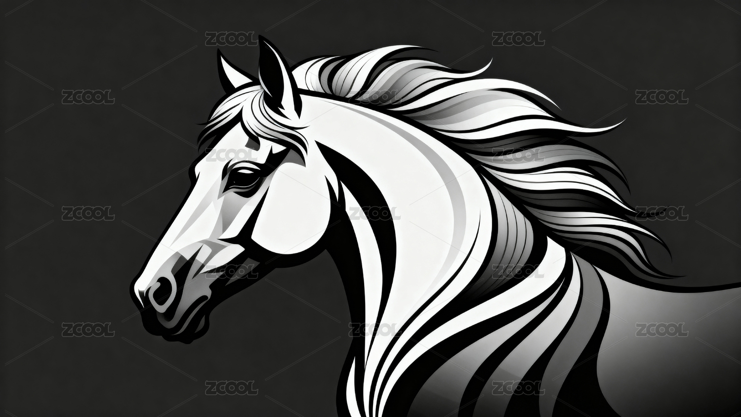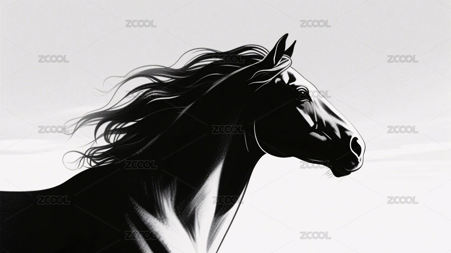 黑白风格飘逸鬃毛马头插画