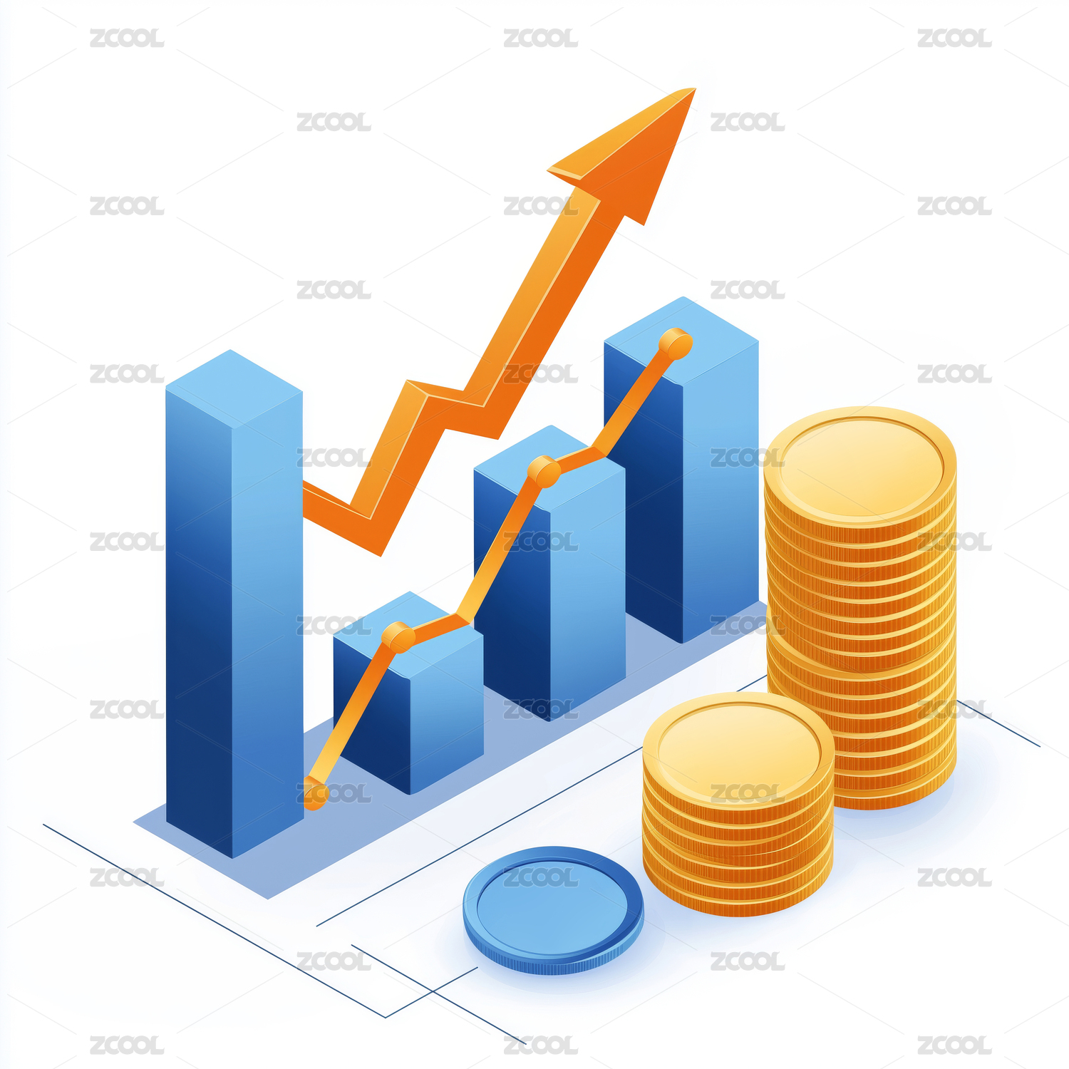 蓝色卡通柱状图和上升箭头金币插画
