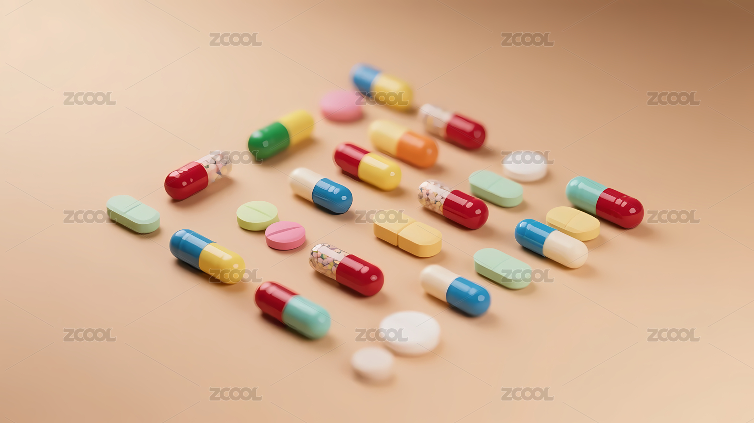 散落的彩色药片与胶囊