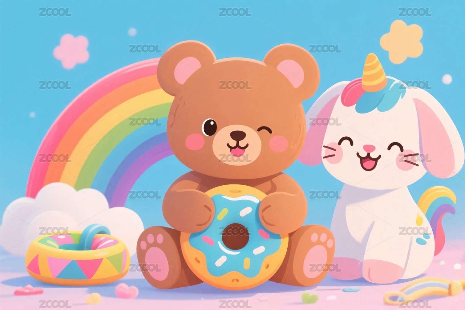 小玩偶,玩具车,彩虹,粉色房屋,儿童玩具,可爱风格,插画,背景,粉色,玩具