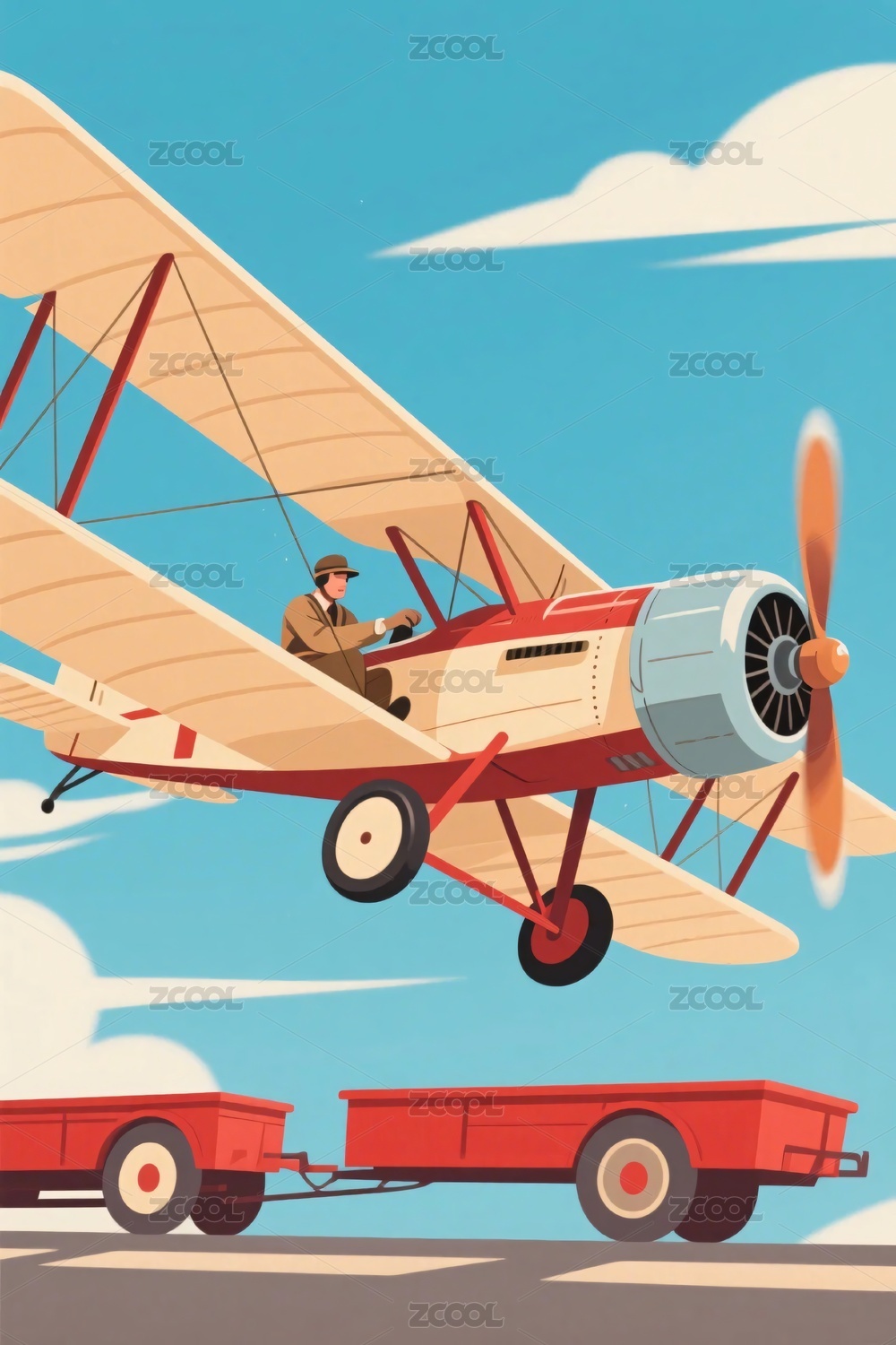 双翼,飞机,引擎,螺旋桨,蓝天,飞行,复古,插画,红色,航空