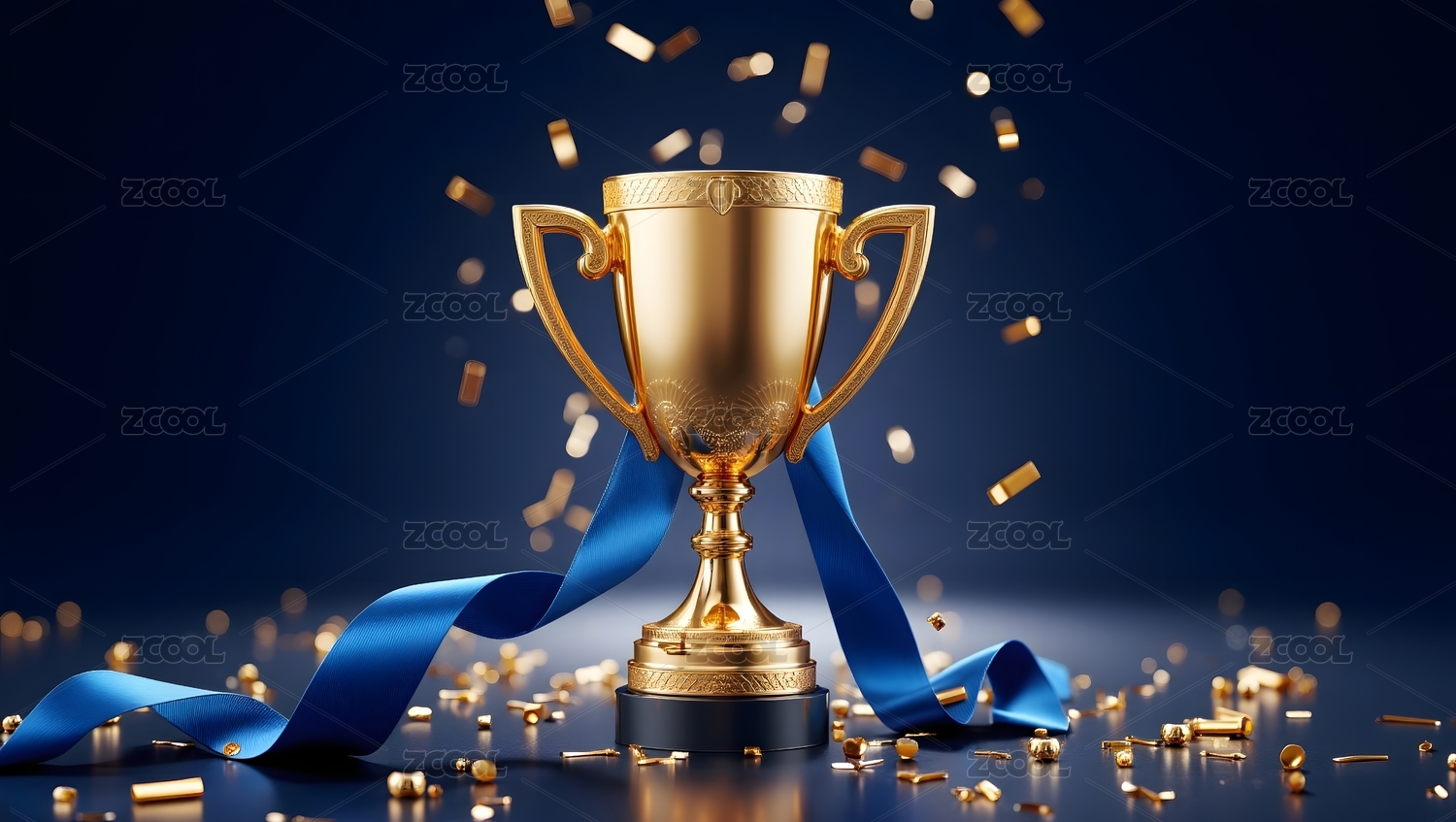 金色奖杯与蓝色丝带