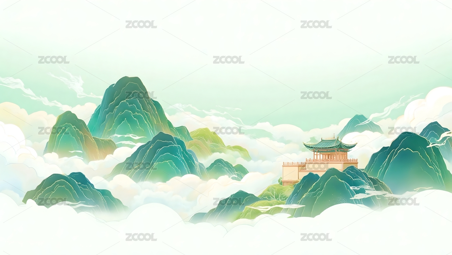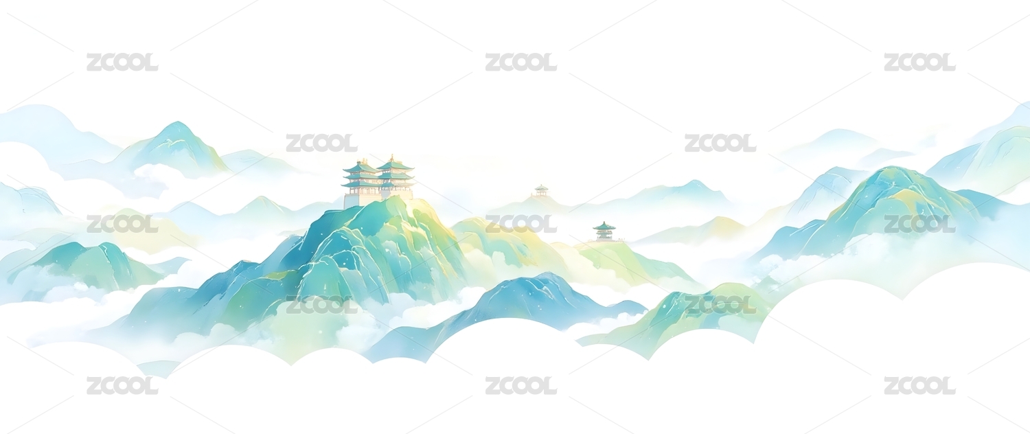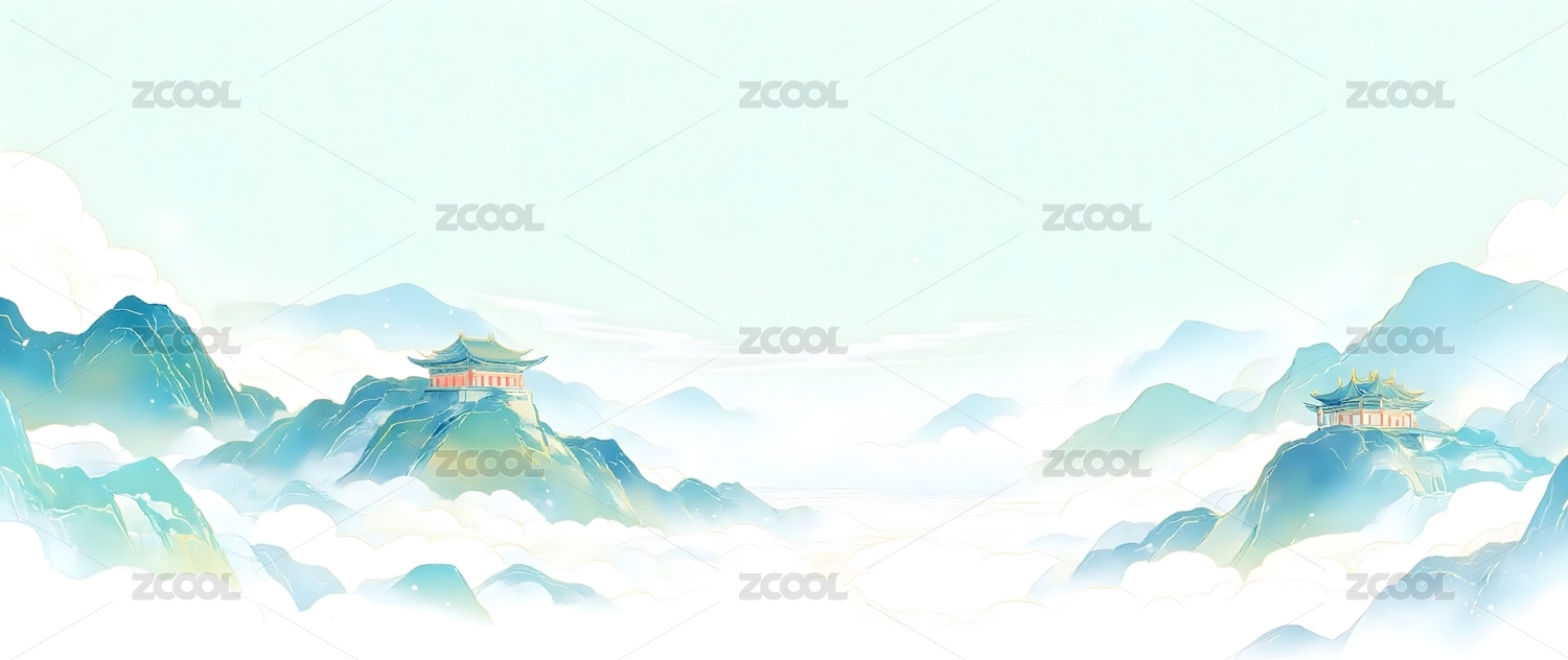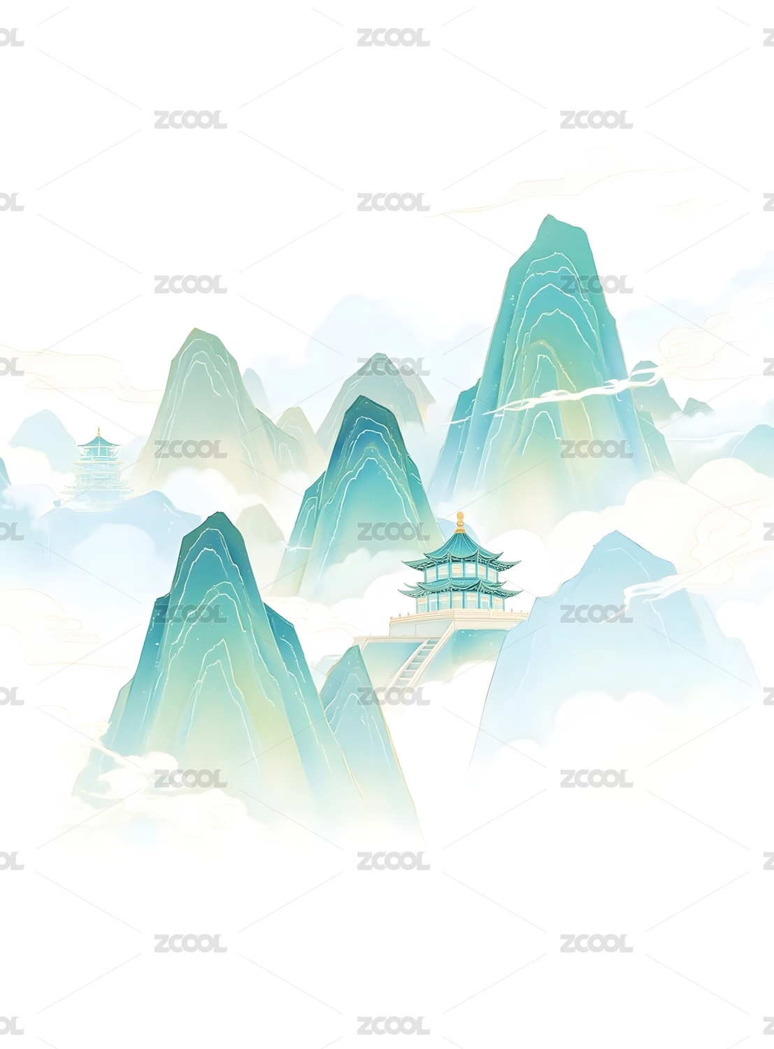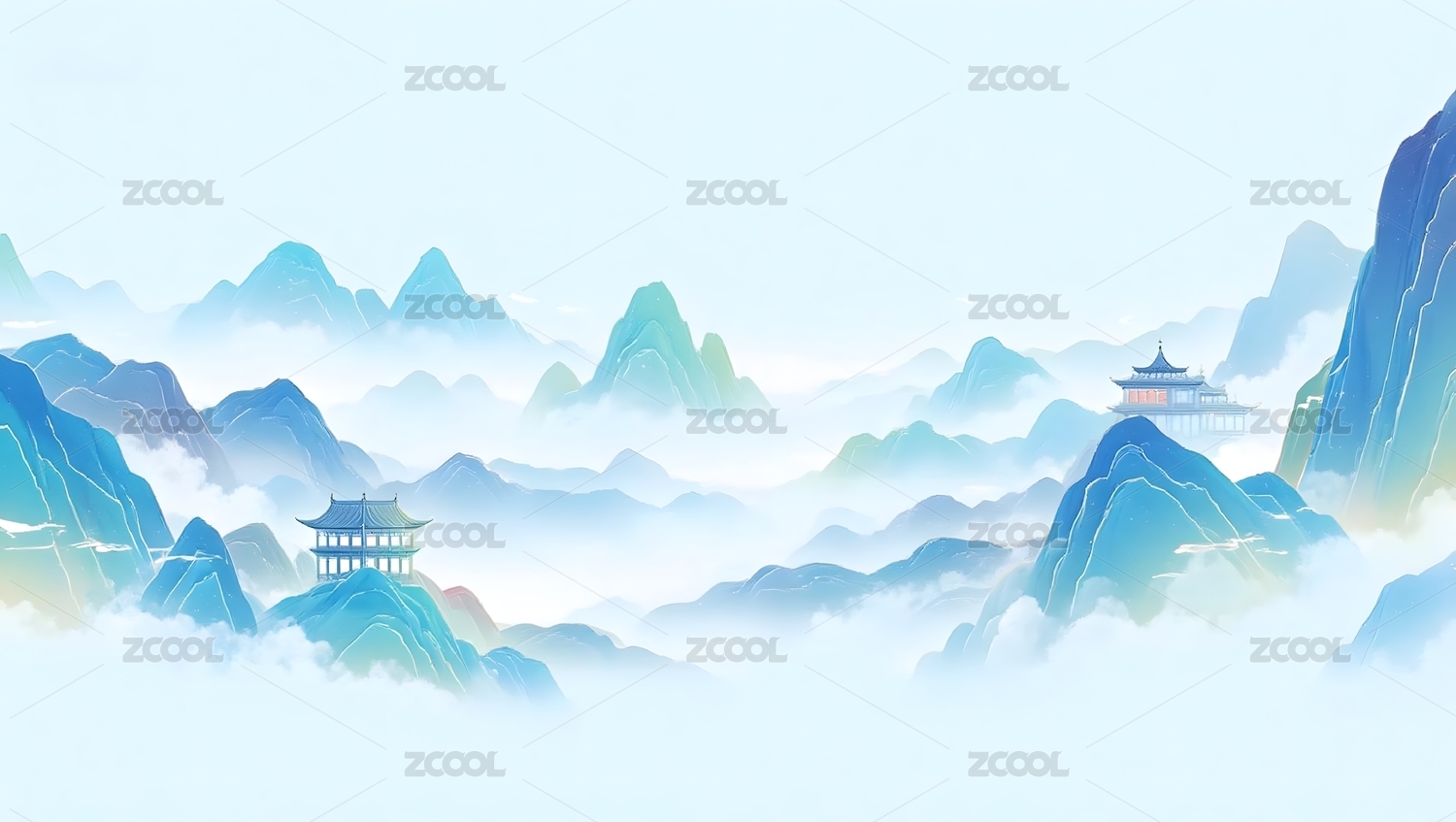 国潮,山水,新中式,中国风,古建筑,云海,楼阁,蓝色,山峰,建筑群