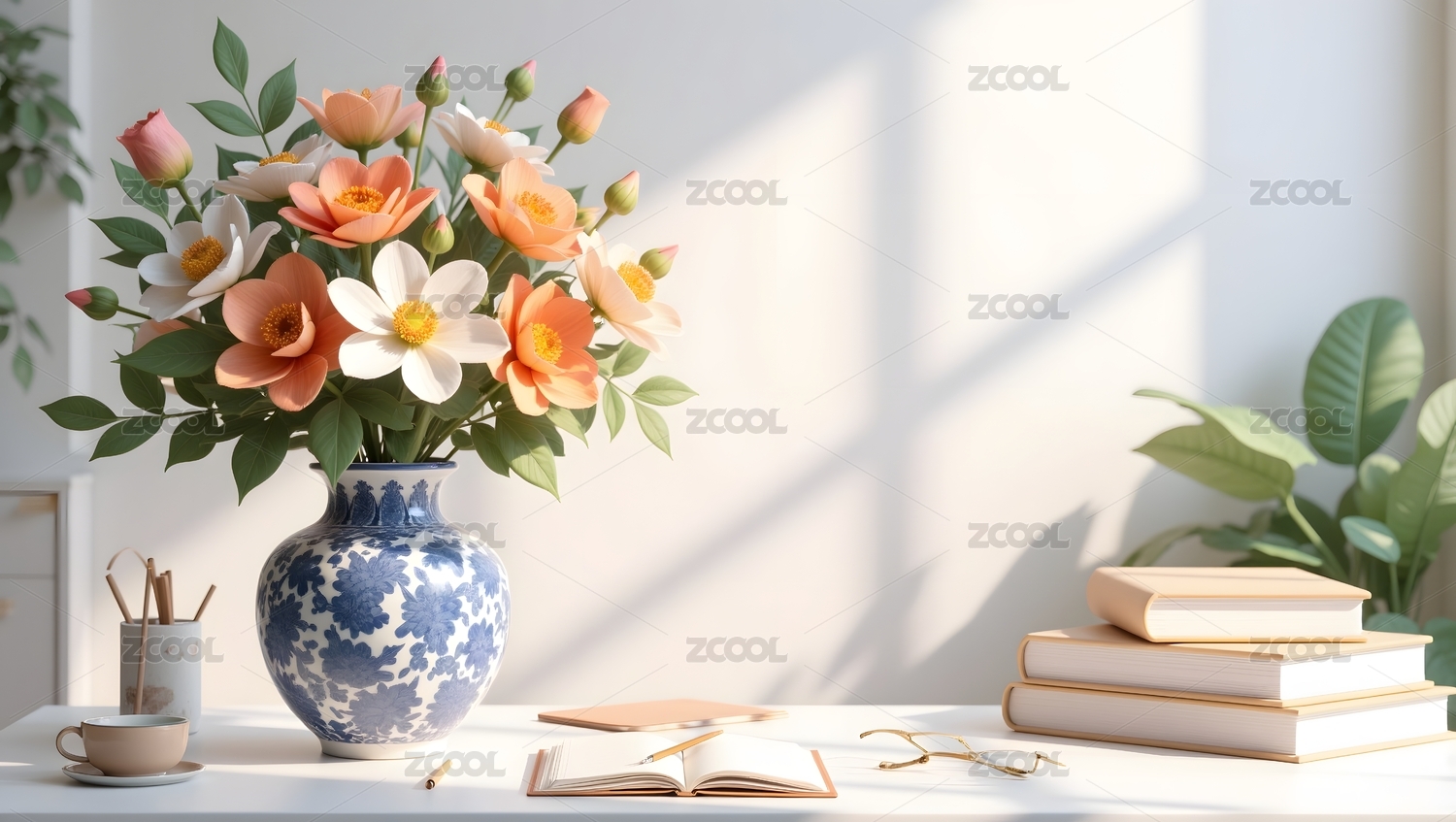静谧书桌上的花束与书籍