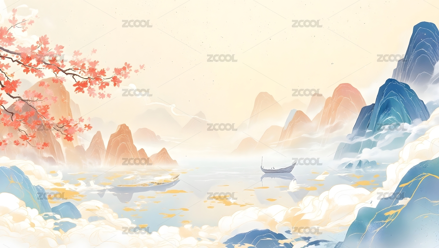 国潮,山水,新中式,中国风,风景,水面,山峦,画风,湖泊,远山