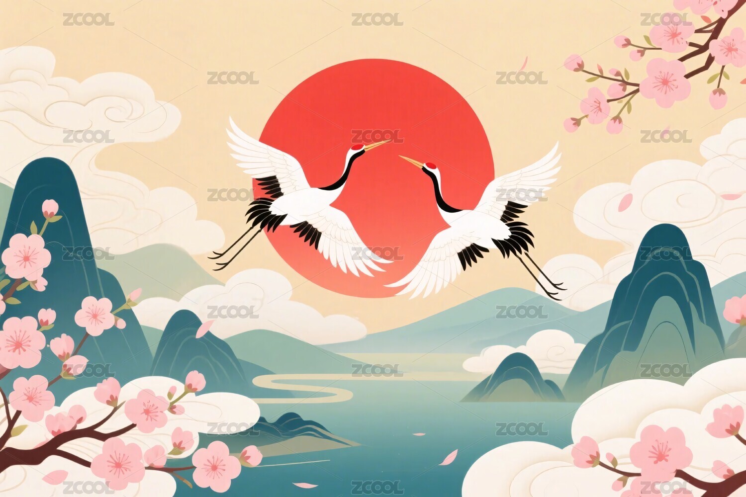 山水丹顶鹤樱花插画