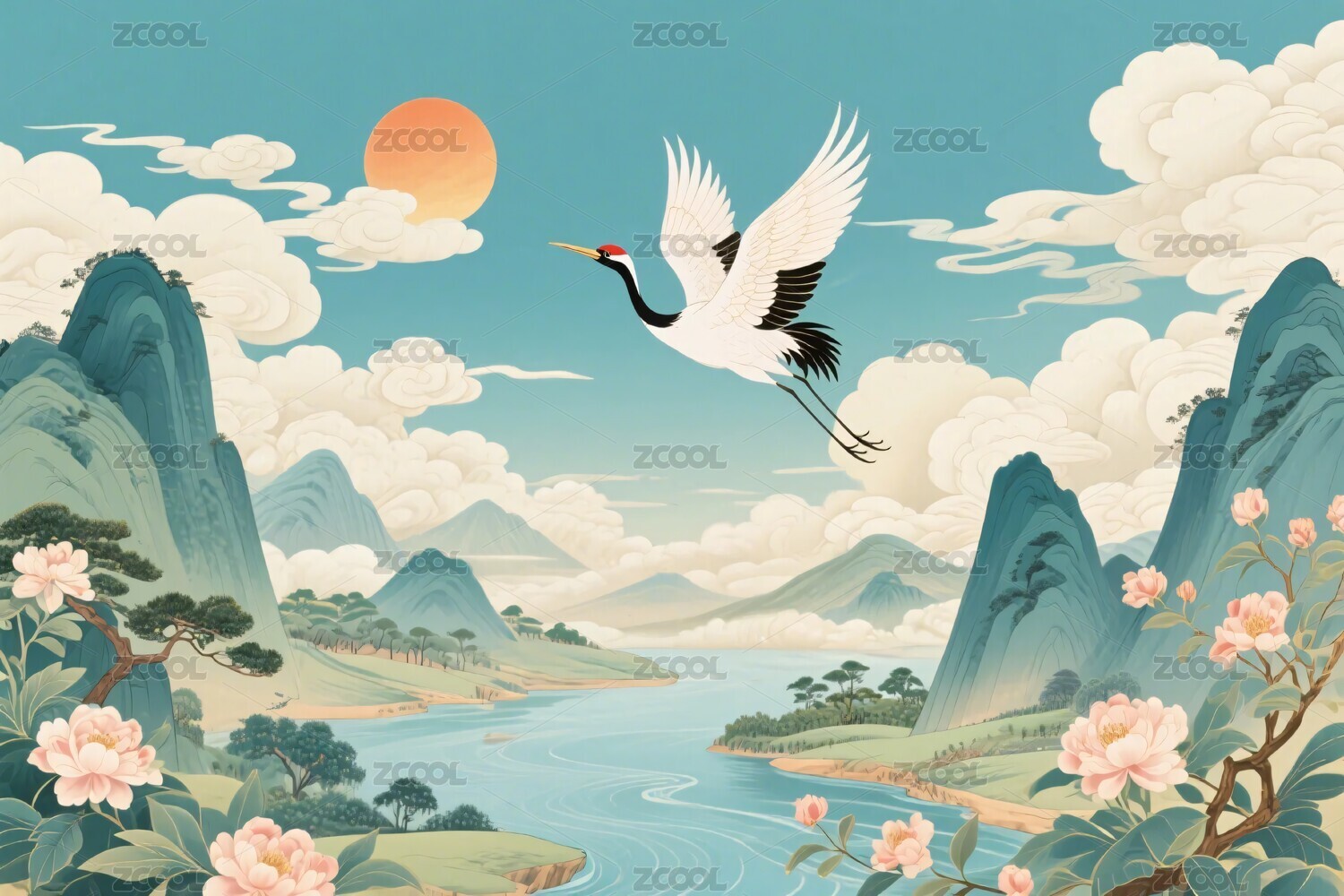 山水飞鹤风景插画