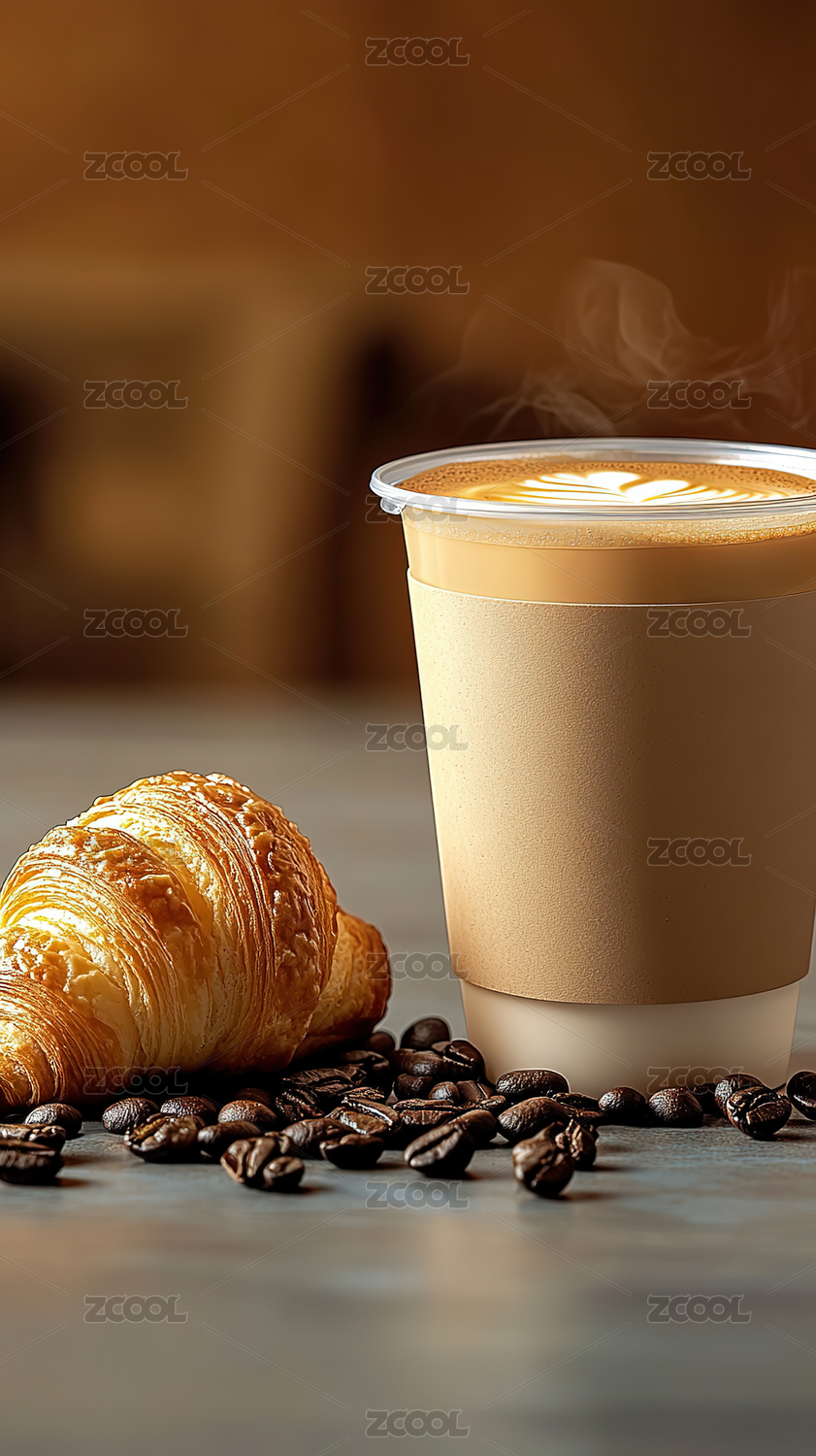 桌面上一杯拿铁咖啡和散落的咖啡豆